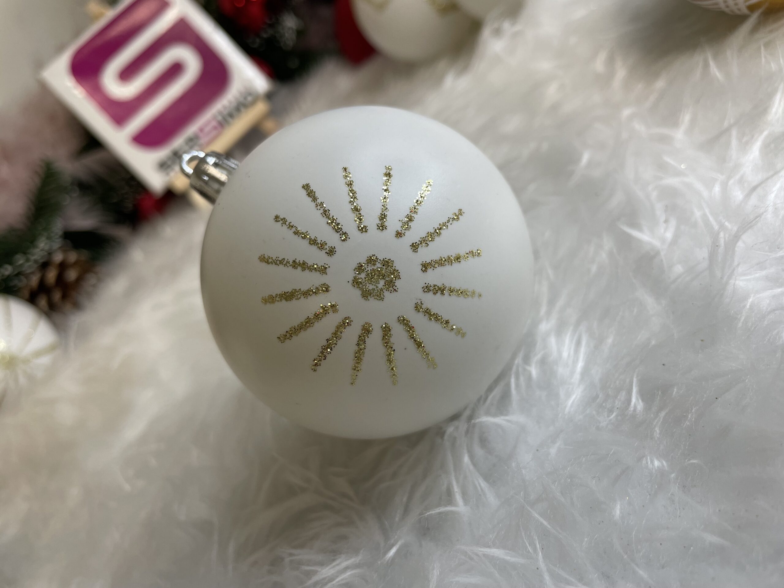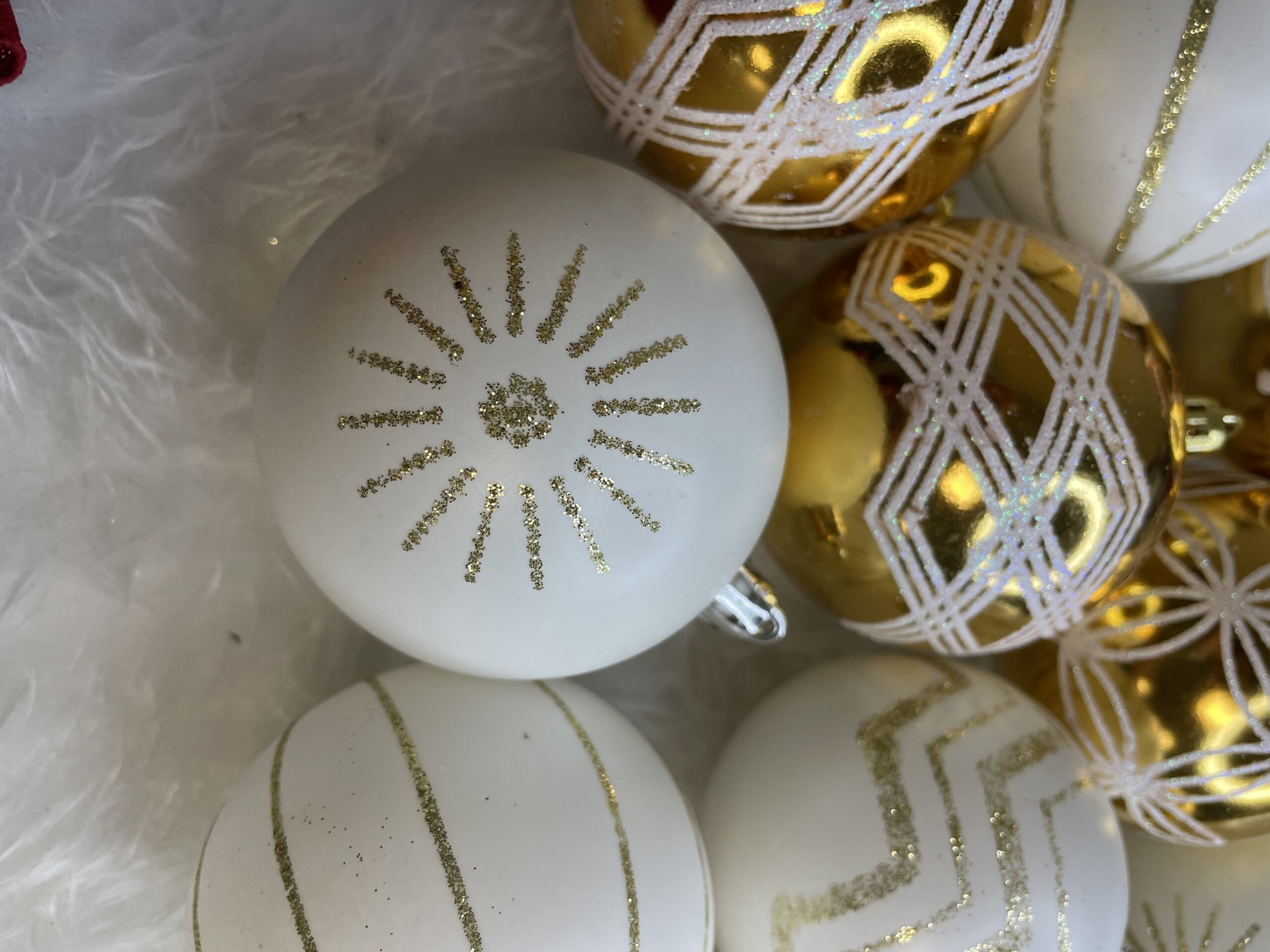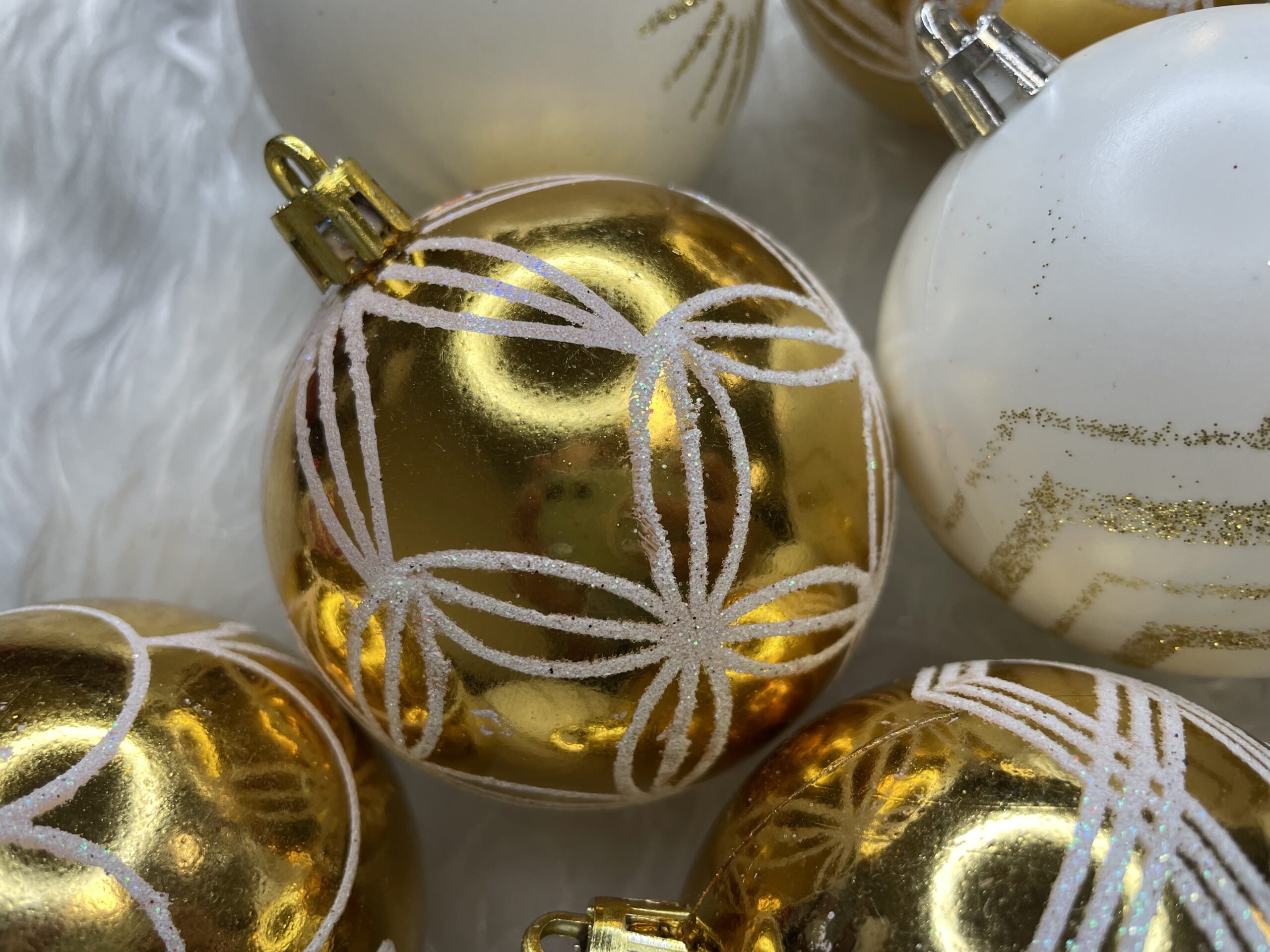Globurile va vor permite sa creati un decor minunat pentru brad. Arata frumos in timpul zilei si dupa intuneric, insotite de iluminat festiv. Setul include snururi care va permit sa agatati globurile rapid si usor in locul dorit. Designul din plastic creste siguranta datorita materialului incasabil. Alegerea lor in locul globurilor de sticla va contribui la siguranta celor mici din casa. Diversele dimensiuni va permit sa creati modele inedite de aranjare a bradului de Craciun. Culoare: alb auriu Material: plastic Cantitate: 30 bucati globuri (+/- 1 bucata) Modele: mat, sclipici, stralucitor Setul include urmatoarele globuri 15 x alb- 5 cm 15 x auriu- 5 cm Atentie! Numarul de piese din set poate varia + - 1 buc.
