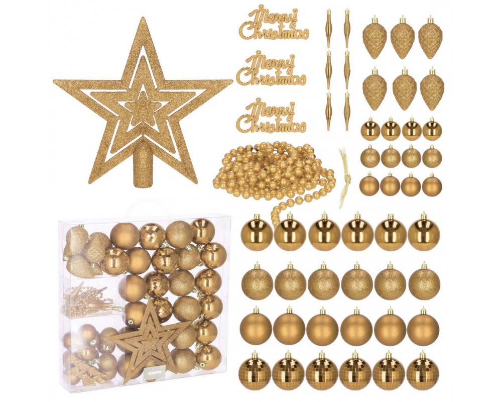 Culoare: auriu Material: plastic Cantitate: 51 bucati globuri (+/- 1 bucata), 1 stea, 1 lant de margele, 3 decoratiuni Craciun fericit Modele: stralucitor, mat, lucios, disco Diametru: diverse marimi Globurile si decoratiunile dintr-un set cu o singura culoare va vor permite sa creati un decor minunat pentru brad. Arata frumos in timpul zilei si dupa intuneric, insotite de iluminat festiv. Setul include snururi care va permit sa agatati globurile rapid si usor in locul dorit. Designul din plastic creste siguranta datorita materialului incasabil. Alegerea lor in locul globurilor de sticla va contribui la siguranta celor mici din casa. Diversele dimensiuni va permit sa creati modele inedite de aranjare a bradului de Craciun. Setul include urmatoarele piese 4 x Glob rotund mic (sclipici) - 4 cm 4 x Glob rotundmic (lucios) - 4 cm 4 x Glob rotundmic (mat) - 4 cm 6 x Glob rotundmare (sclipici) - 6 cm 6 x Glob rotundmare (lucios) - 6 cm 6 x Glob rotundmare (mat) - 6 cm 6 x Glob rotundmare (minge disco) - 6 cm 6 x Glob con- 6 cm 6 x Glob ghetar ingust - 9 cm 3 x Decoratiune Craciun fericit - 4x10cm 1 x Varf in forma de stea- 20 cm 1 x lant de margele - 2 m Atentie! Numarul de piese din set poate varia + - 1 buc.