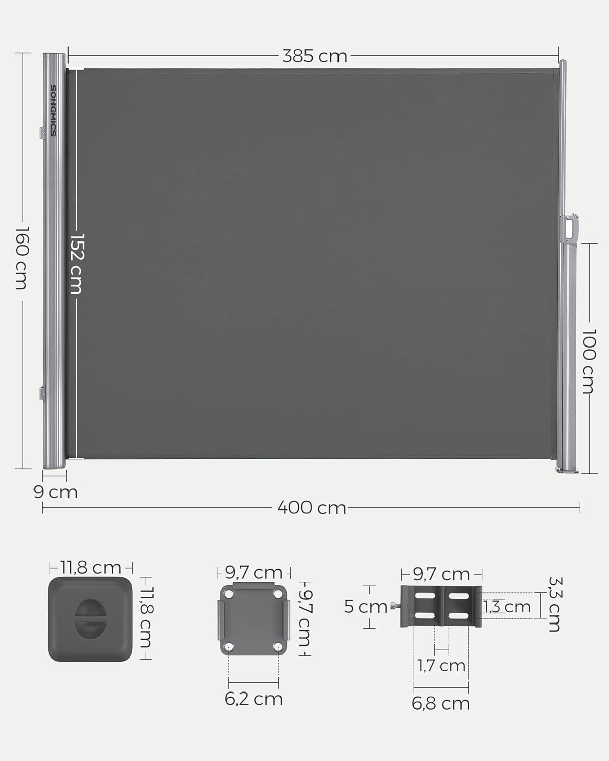 Detalii despre produs: Culoare: Antracit Material: Aliaj de aluminiu, poliester (280 g/m²), strat PU Dimensiuni: 160 x 400 cm (H x L) Greutatea produsului: 9,7 kg Tesatura de copertina din poliester acoperit cu PU de 280 g/m² este rezistenta la stropire si la soare, fiind perfecta pentru protejarea intimitatii si blocarea soarelui datorita UPF 50+. De asemenea, este rezistenta la decolorarea culorilor.Caseta acestui marchizon lateral si stalpul de sustinere sunt fabricate din aliaj de aluminiu de inalta calitate, in timp ce suruburile sunt fabricate din aliaj de zinc-nichel rezistent la rugina si de lunga durata.Datorita instructiunilor clare si a accesoriilor de asamblare incluse, puteti asambla aceasta marchiza in cel mai scurt timp. In plus, o baza de podea cu capac ofera o alta optiune de montare pentru o utilizare mai convenabila.Aceasta marchiza retractabila are un arc de inalta calitate si poate fi intinsa cu usurinta fara niciun zgomot deranjant in timpul utilizarii.Un cort lateral de 160 x 400 cm de la SONGMICS care poate fi folosit pentru a va umbri balconul sau terasa, plus o incuietoare de siguranta pentru copii pe maner care face ca acest cort de exterior sa fie si mai fiabil.