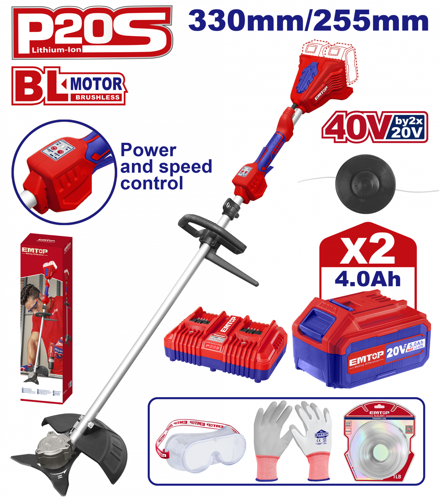 Motocoasa electrica/Trimmer cu fir cu 2 acumulatori 4.0Ah, motor fara perii (brushless), 330mm/255mm, accesorii incluse - ELMR200285, EMTOP