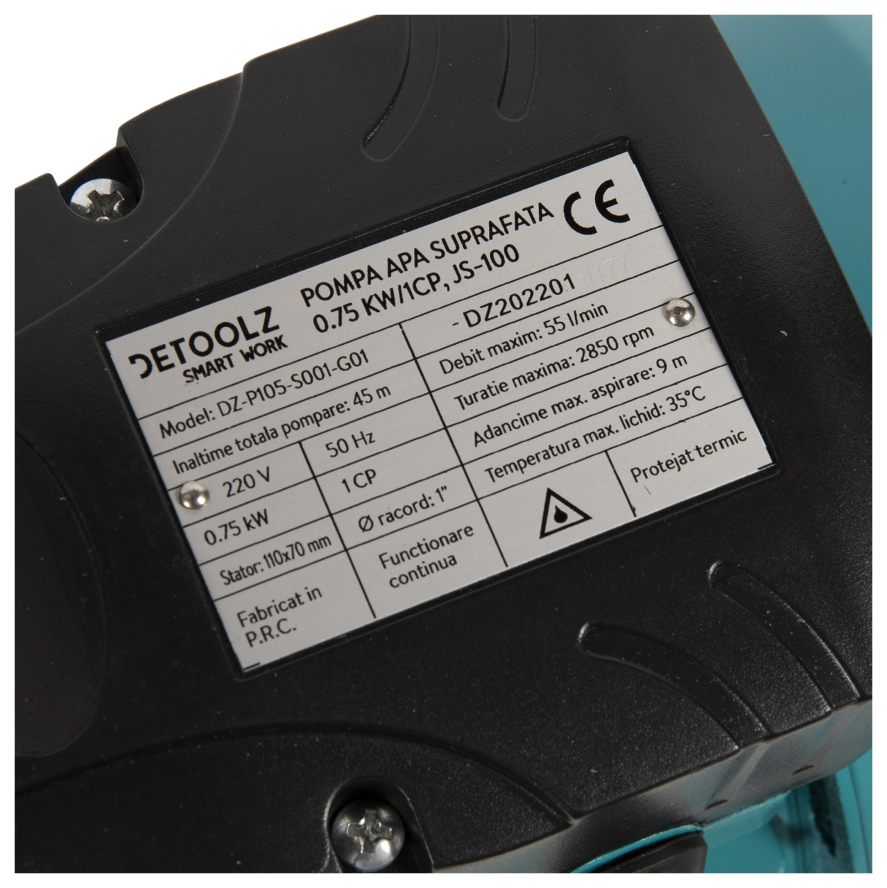 Caracteristici pompa de apa pentru suprafata 0,75kW/1HP, JS 100SS, Detoolz DZ-P105-S001-G01: