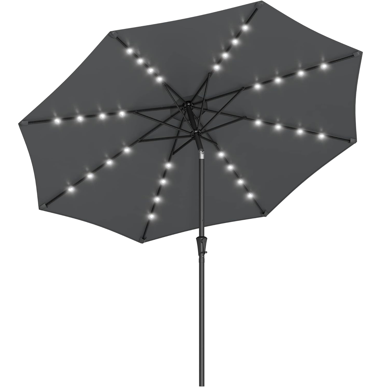 Specificatii: Culoare: Gri Material: Cadru din otel, tesatura din poliester de 180 g/m². Curbura suprafetei umbrelei: 3 m Diametrul baldachinului: 2,9 m Inaltimea produsului: 2,5 m Diametrul stalpului: 38 mm Greutatea produsului: 7,2 kg Despre acest articol Aceasta umbrela de umbrela are 32 de lumini LED alimentate de lumina soarelui, creand o atmosfera romantica seara, atunci cand comutatorul de pe stalp este pornit.Parasolarul din poliester de 180 g/m² cu protectie UPF 50+ blocheaza peste 98% din razele UV. De asemenea, este hidrofug pentru a va proteja de ploaie.Inclinati cu usurinta baldachinul prin apasarea butonului de pe articulatie. Articulatia din aliaj de zinc este mai puternica si mai sigura decat cele obisnuite din aliaj de aluminiu.Pur si simplu rotiti manivela pentru a deschide si inchide convenabil aceasta umbrela de umbrela de 3 m. Rapid si usor!Cadrul acestui parasolar de gradina este puternic si durabil, fabricat din otel de calitate acoperit cu pulbere, rezistent la rugina, asigurand o durata de viata prelungita. Note: Baza nu este inclusa. Inchideti umbrela de soare in zilele cu vant pentru a evita deteriorarea produsului. Nu deschideti umbrela cu forta, mecanismul de inclinare are nevoie de o deschidere lenta si usoara.