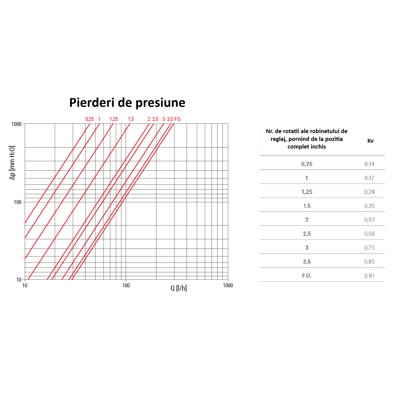 - Pierdere de presiune: Kv intre 0,14 si 0,91 in functie de numarul de rotatii ale robinetului