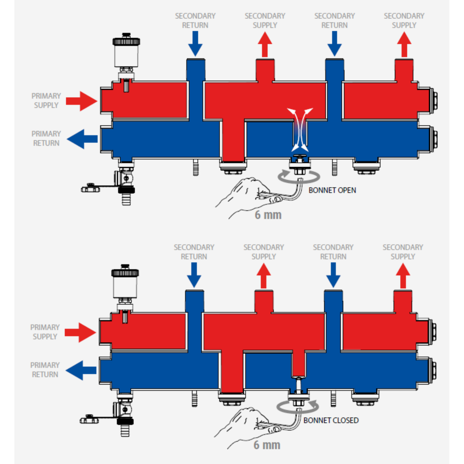 - Separator hidraulic – cand vitonul este deschis complet cu o cheie imbus de 6 mm, permitand echilibrarea intre debitul primar si cel secundar