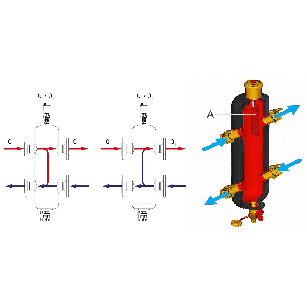 - Separator hydraulic: decupleaza circuitul primar de cel secundar, permitand functionarea independenta a pompelor si echilibrarea diferentelor de debit.