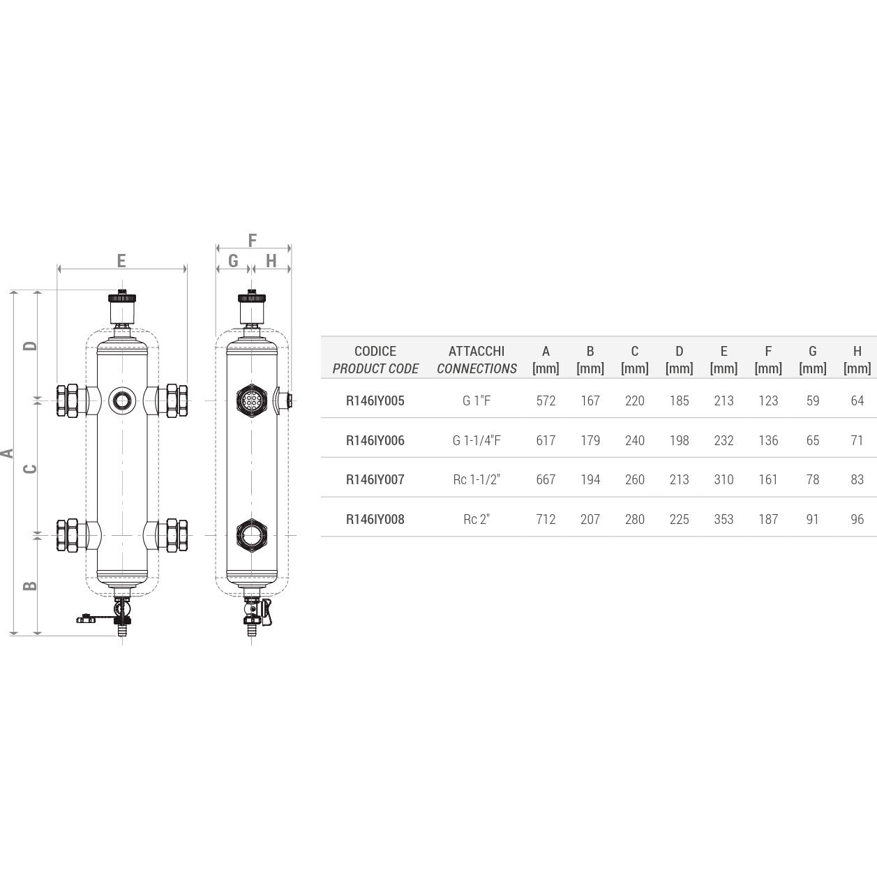 Separatorul hidraulic Giacomini R146IY006 este un dispozitiv profesional utilizat in instalatiile termice si HVAC moderne pentru a asigura separarea eficienta intre circuitul primar (de productie) si cel secundar (de distributie), oferind in acelasi timp functii avansate de defangare (eliminare a impuritatilor) si disaerare (eliminare a aerului).
