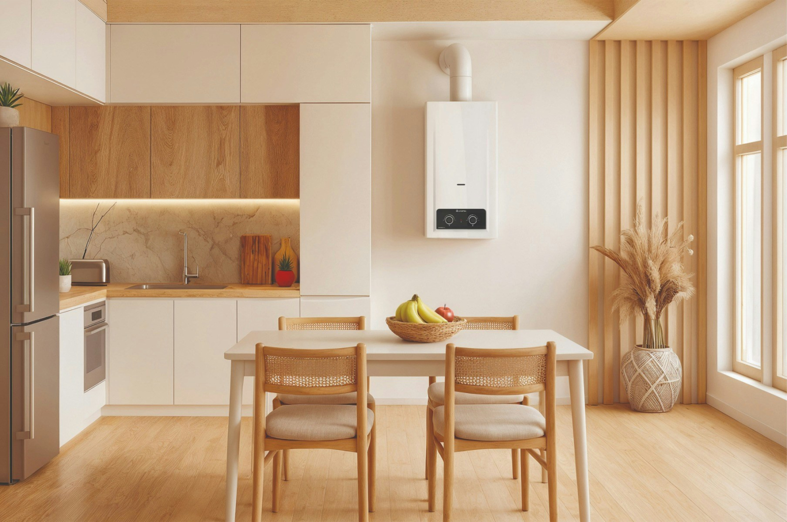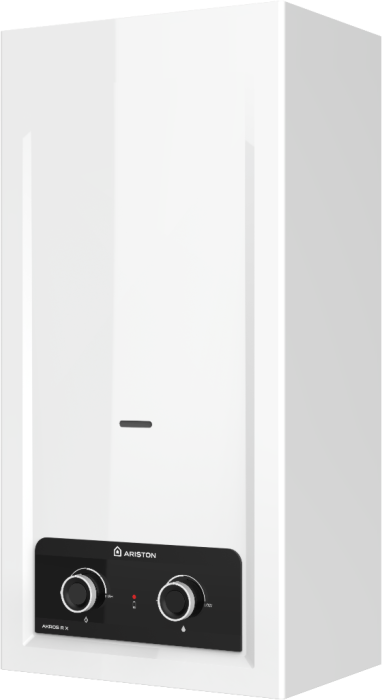 Încălzitor instant de apă cu funcționare pe gaz, cameră deschisă, tiraj natural. Reglare mecanică prin două butoane, aprindere silențioasă — disponibil în variante GN și GPL.