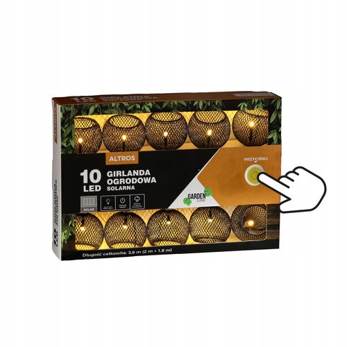 Specificatie: Ghirlanda solara 10 becuri Baterie 1.2 V Lungime 1.8 M Lungime cablu de alimentare 2 M Distanta dintre becuri 20 cm Moduri de iluminare: 2 ( continuu, intermitent) Culare: alb cald Timp de incarcare: 8 ore la soare Ghirlanda luminoasa decorativa este solutia perfecta pentru gradina ta! Ghirlandele schimba atmosfera locului de indata ce incep sa straluceasca cu lumina lor calda si blanda. Ghirlanda solara poate fi folosita pentru a ilumina decorativ, printre altele: pergole, balustrade, balcoane, terase, gard, arhitectura gradinii. Ghirlanda este destinata utilizarii in aer liber si trebuie expusa la lumina soarelui in timpul zilei pentru a incarca eficient bateria.Este realizata din material durabil, ceea ce contribuie la durabilitate si viata lunga.In plus fata de avantajul sau practic incontestabil, cu siguranta va face mai atractiva petrecerea timpului in aer liber cu familia, prietenii sau singuri.