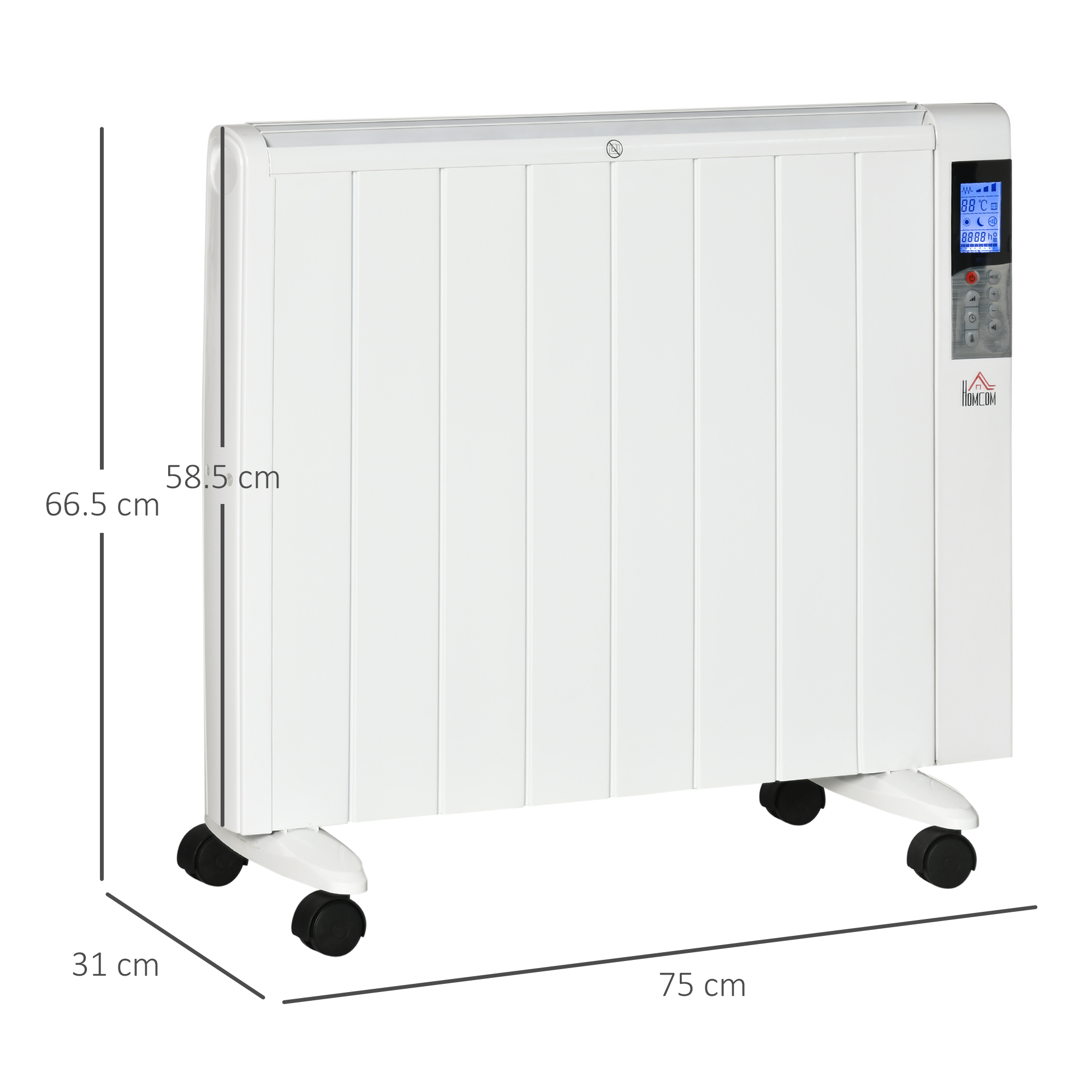 - • Dimensiuni: 58.5Hcm x 75L x 7.5lcm (fara picioare). 66.5 Hcm x 75L x 31l cm (cu picioare). Cablu electric: 160cm