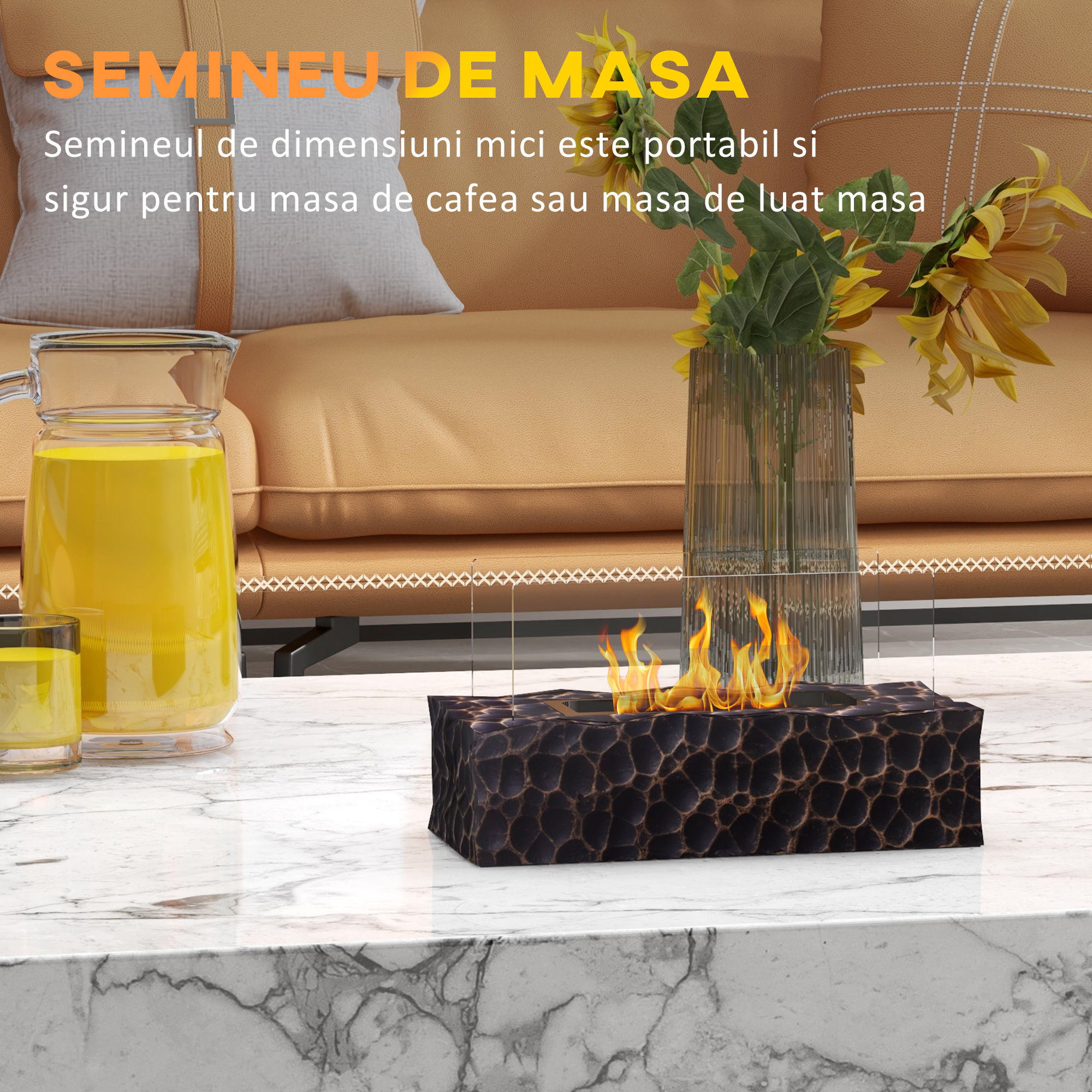 Spuneti adio scanteilor si vreascurilor; semineul nostru cu alcool [BRAND NAME] face o declaratie in spatiul dumneavoastra fara intretinere sau pericole. Fie ca este vorba de o seara de joc in familie, o cina sau o intalnire la film, lucrurile sunt pe cale sa devina foarte confortabile. Imaginati-va ca va relaxati in fata semineului dumneavoastra de interior reconfortant, fara efort, dupa o zi lunga la serviciu si veti incepe sa va faceti o idee despre cat de relaxant poate fi. Relaxati-va si prajiti niste bezele cu acest semineu personal [BRAND NAME].