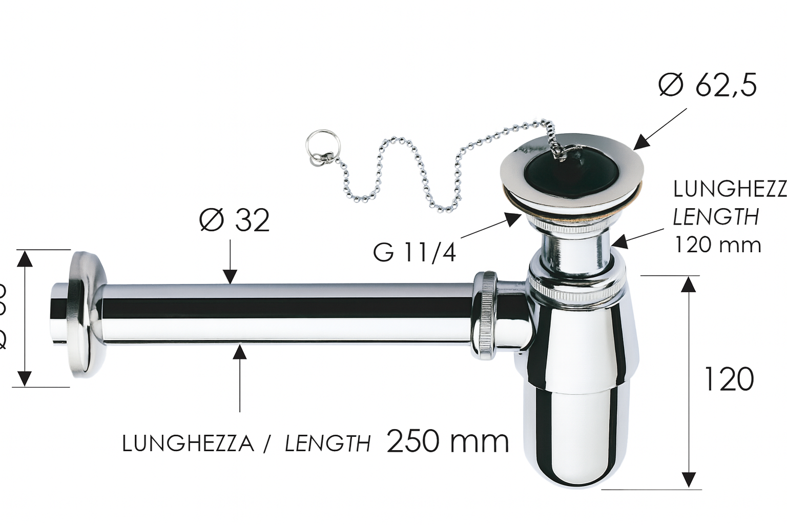 Sifon lavoar metalic Remer Rubinetterie 973Z114, racord 1"1/4, lungime 250 mm, alama si zamac cromat