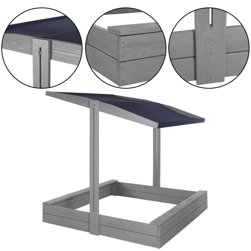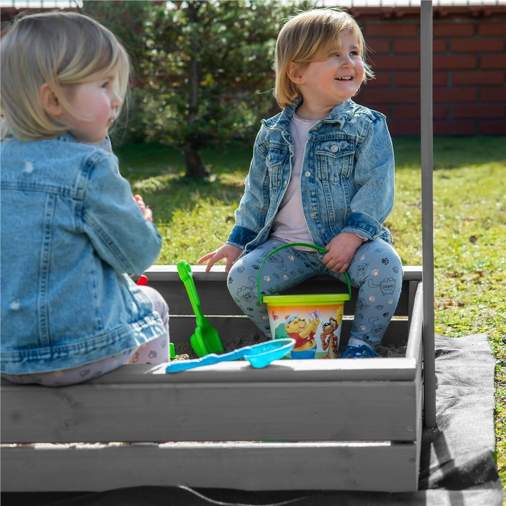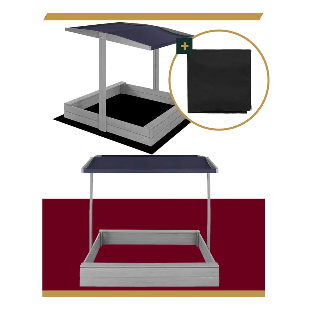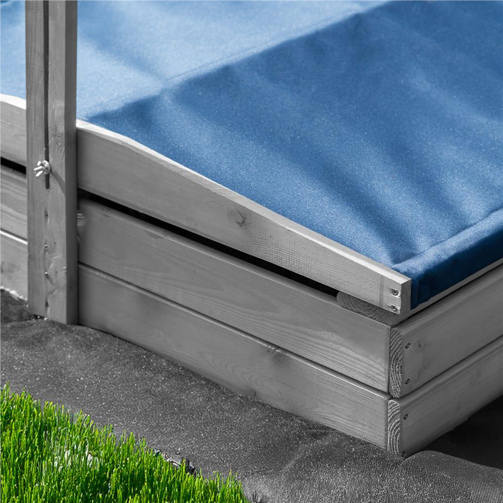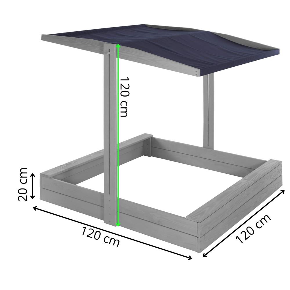 Specificatii tehnice: Tip produs: Lada de nisip cu baldachin si capac Material: Lemn de conifere tratat ecologic Culoare lemn: Gri Culoare acoperis: Albastru inchis Certificare: CE Potrivit pentru: Copii peste 18 luni Dimensiuni exterioare: 120 x 120 x 120 cm Inaltime bancute: 20 cm Dimensiuni baldachin: 120 x 120 cm Grosime scanduri: 1,8 cm Latime scanduri: 8,5 cm Latime sezut: 8,5 cm Dimensiuni geotextil (inclus): 150 x 160 cm Capacitate aproximativa: 240 litri Greutate estimata: ~13-15 kg Accesorii incluse: Geotextil negru, set montaj complet Functii: Acoperis reglabil, inchidere completa, bancute laterale fara spatar Scurta descriere: Aceasta lada de nisip din lemn masiv este alegerea ideala pentru gradina sau curte. Echipata cu baldachin reglabil si bancute laterale, asigura un loc sigur si placut pentru joaca. Poate fi inchisa dupa utilizare pentru a proteja nisipul. Produs fabricat in Polonia, finisat cu grija si certificat CE pentru siguranta copiilor. Caracteristici principale: Lemn tratat ecologic, rezistent la intemperii Acoperis textil ajustabil pentru umbra si protectie Functie de inchidere – capac rabatabil din bancute Include geotextil pentru izolarea solului Marginile sunt rotunjite pentru siguranta copiilor Design compact, usor de integrat in gradina Capacitate de pana la 240 litri de nisip Certificare CE – sigur pentru copii Montaj facil cu gauri preforate Cadou perfect pentru zile de nastere sau vara