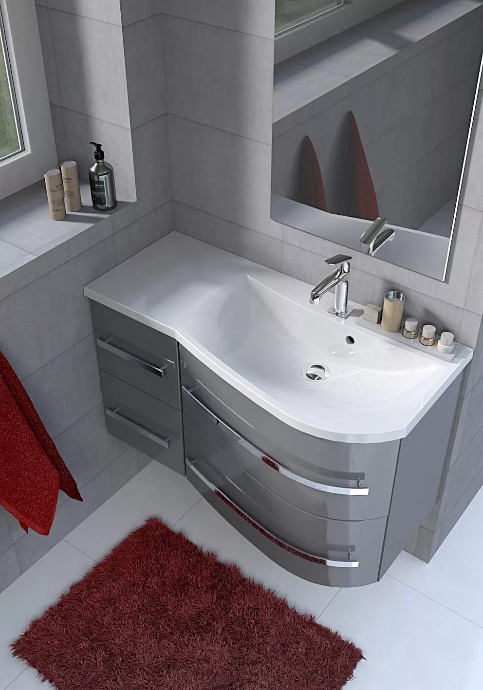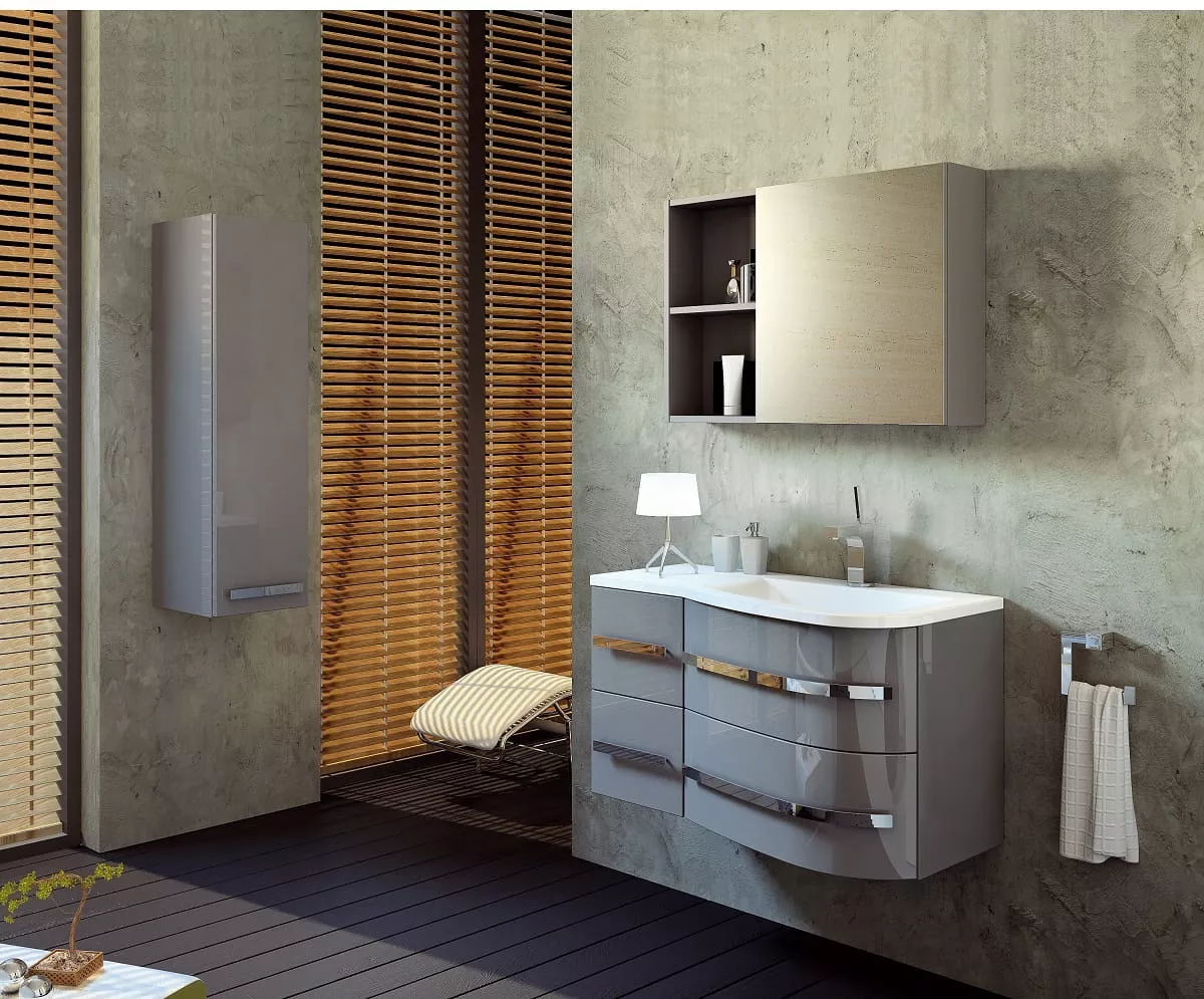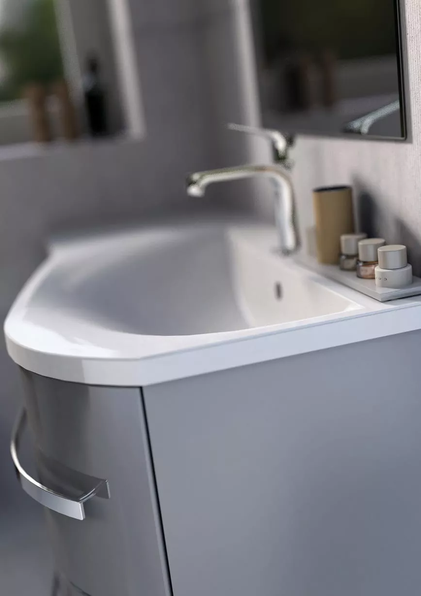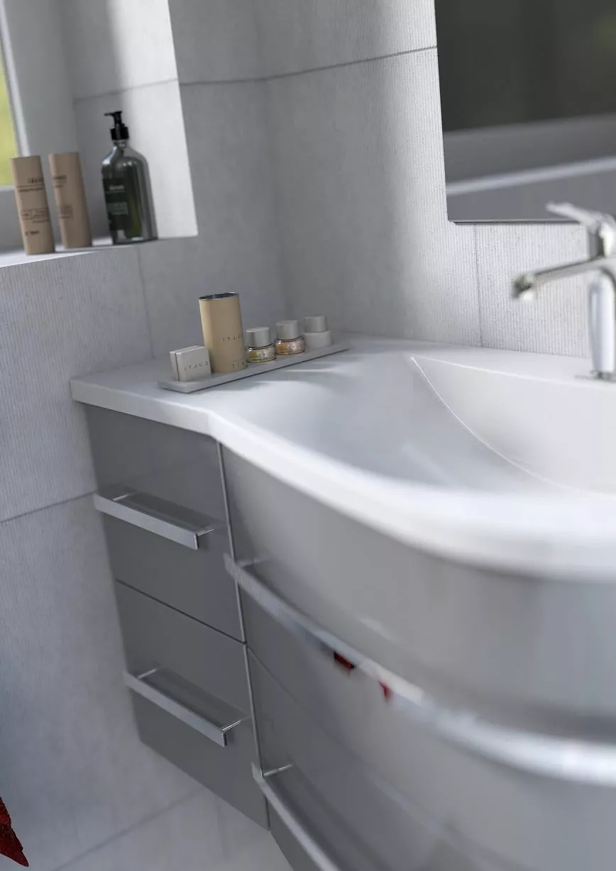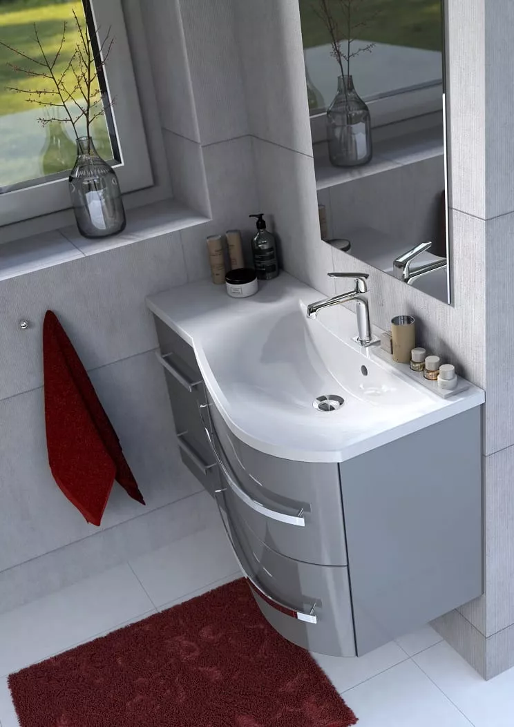 OPAL este una dintre numeroasele colecții ORiSTO echipate cu fronturi curbate, îndoite. Această tehnologie, care necesită cele mai înalte abilități, permite ca spațiul încăpător al sertarelor să fie închis într-o formă proporțională și atractivă vizual. Dulapurile de sub chiuvetă, datorită formei lor și posibilității de montare pe colț, sunt perfecte și pentru băile mici. O chiuvetă sintetică perfect asortată și mânere cromate de înaltă calitate care se armonizează cu luciul lacului din față - toate acestea creează imaginea unei soluții coerente vizual, funcționale și compacte.