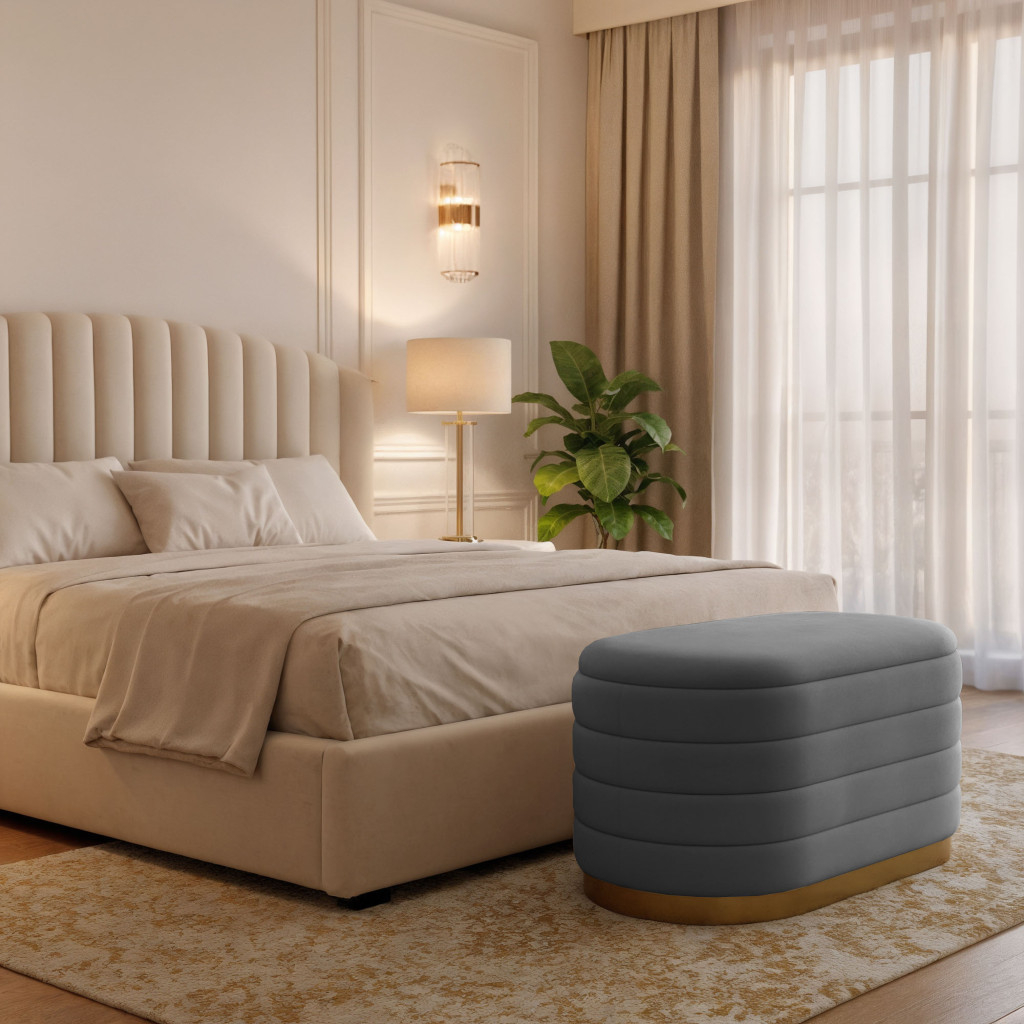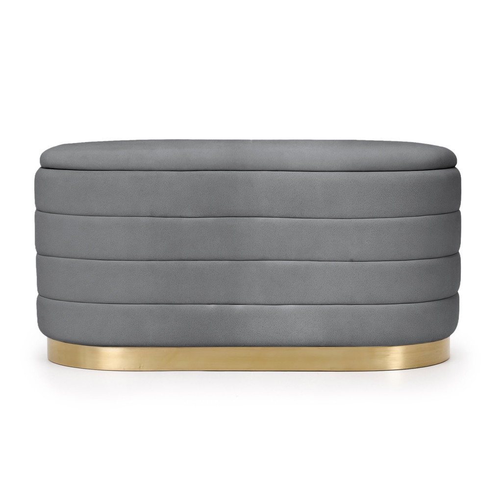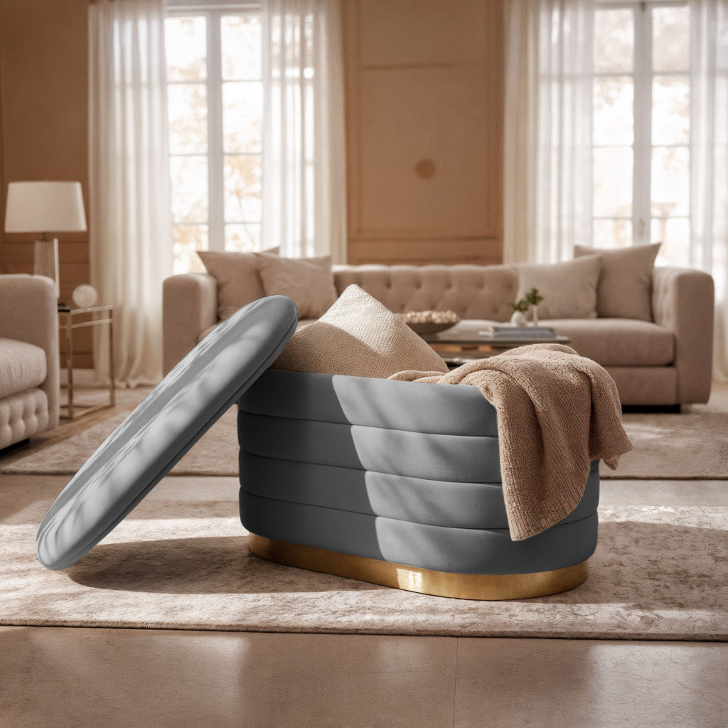 Bancheta tip puf Bella cu spatiu de depozitare, realizata din velur fin la atingere, ideala pentru interioare elegante si rafinate. Compartimentul interior permite depozitarea discreta a obiectelor, iar designul modern glamour completeaza armonios livingul, dormitorul sau holul.