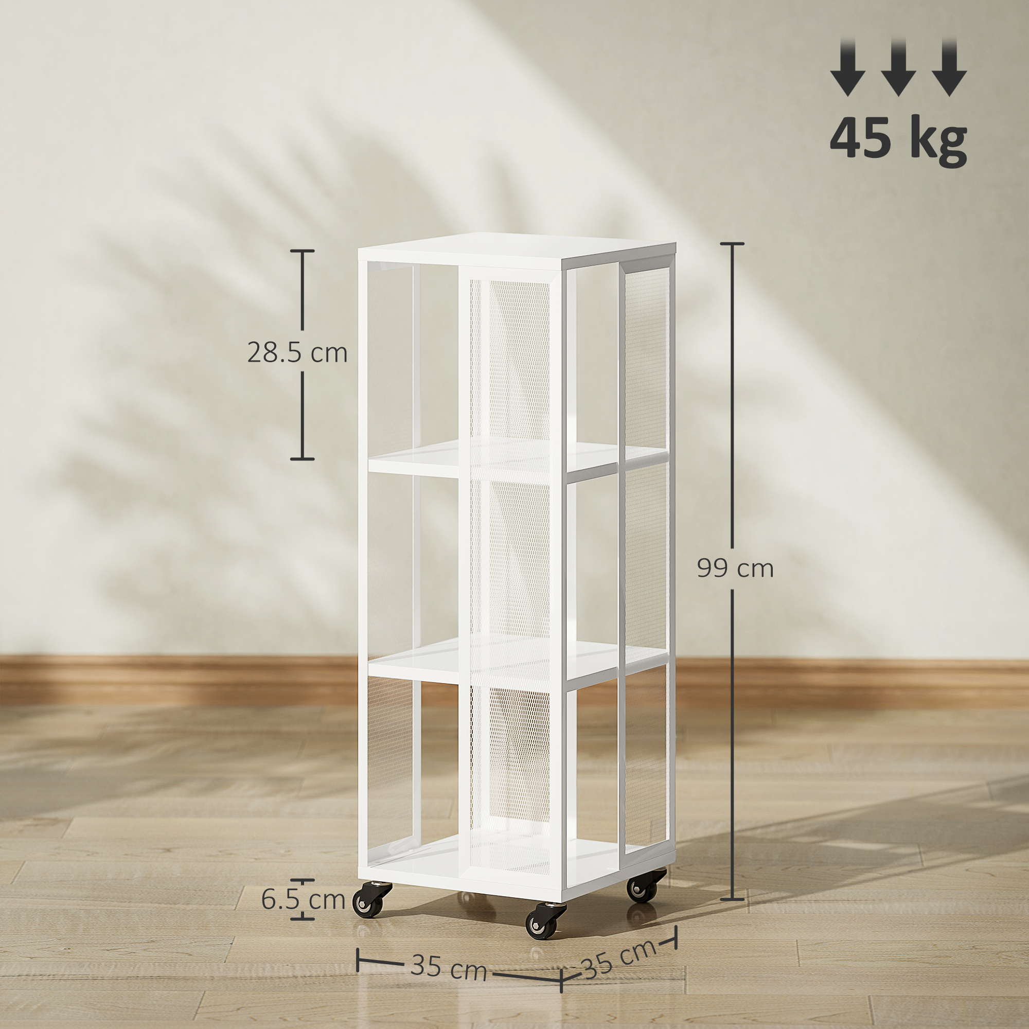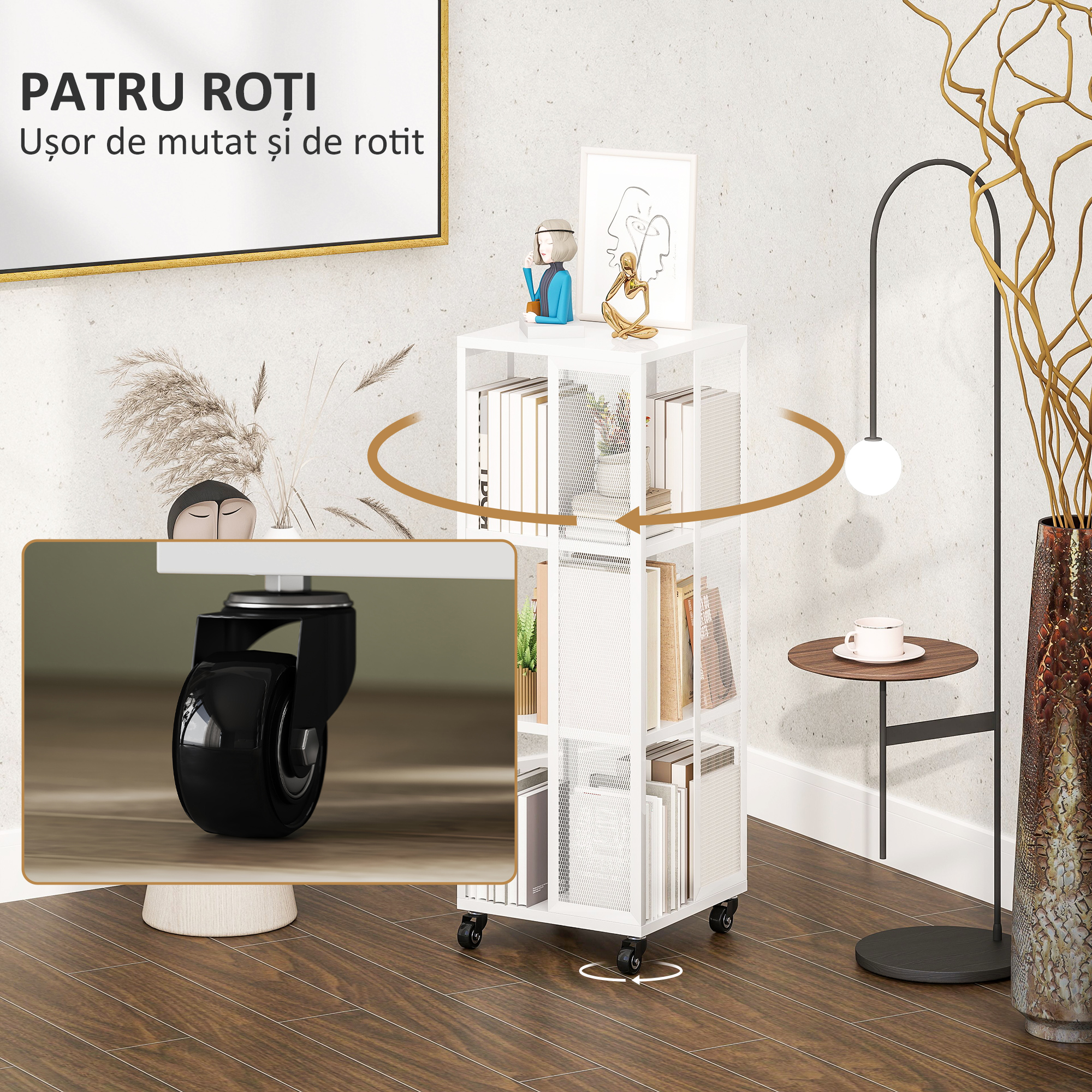 Exploreaza versatilitatea bibliotecii moderne [BRAND NAME], un accesoriu rafinat pentru orice incapere. Acest raft de biblioteca rotativ si mobil pe roti faciliteaza accesul si organizarea cartilor, revistelor si a multor altora. Cu trei rafturi din plasa metalica rezistenta, biblioteca noastra moderna ofera o solutie sic pentru carti si obiecte decorative. Perfecta pentru living, dormitor sau birou, imbogateste spatiile cu o nota de simplitate moderna.