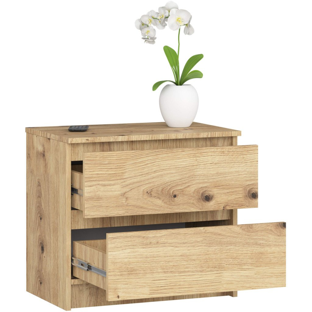 Comoda compacta cu 2 sertare, in finisaj cald de stejar artisan, realizata din PAL laminat de inalta calitate, rezistent la uzura. Designul sau natural si versatil o face ideala pentru dormitor, living sau birou, oferind spatiu suplimentar de depozitare intr-un stil elegant si modern.