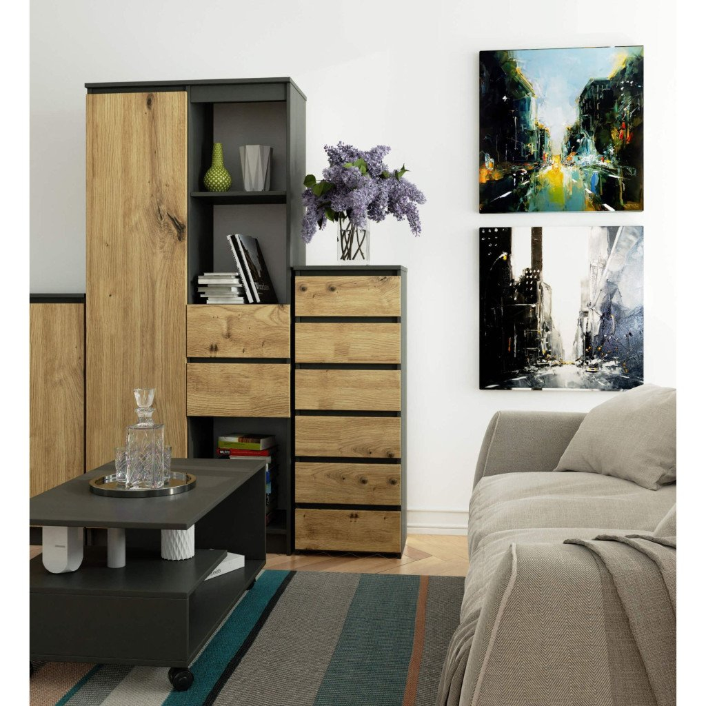 Comoda cu 6 sertare in finisaj gri grafit cu fronturi stejar artisanal este o alegere moderna si eleganta pentru dormitor, living sau camera copiilor. Structura rezistenta, fronturile in stil natural si sertarele spatioase fac din aceasta comoda o piesa practica si estetica. Sertarele se deschid lin datorita glisierelor metalice, iar marginile cu ABS ofera un plus de protectie si durabilitate.