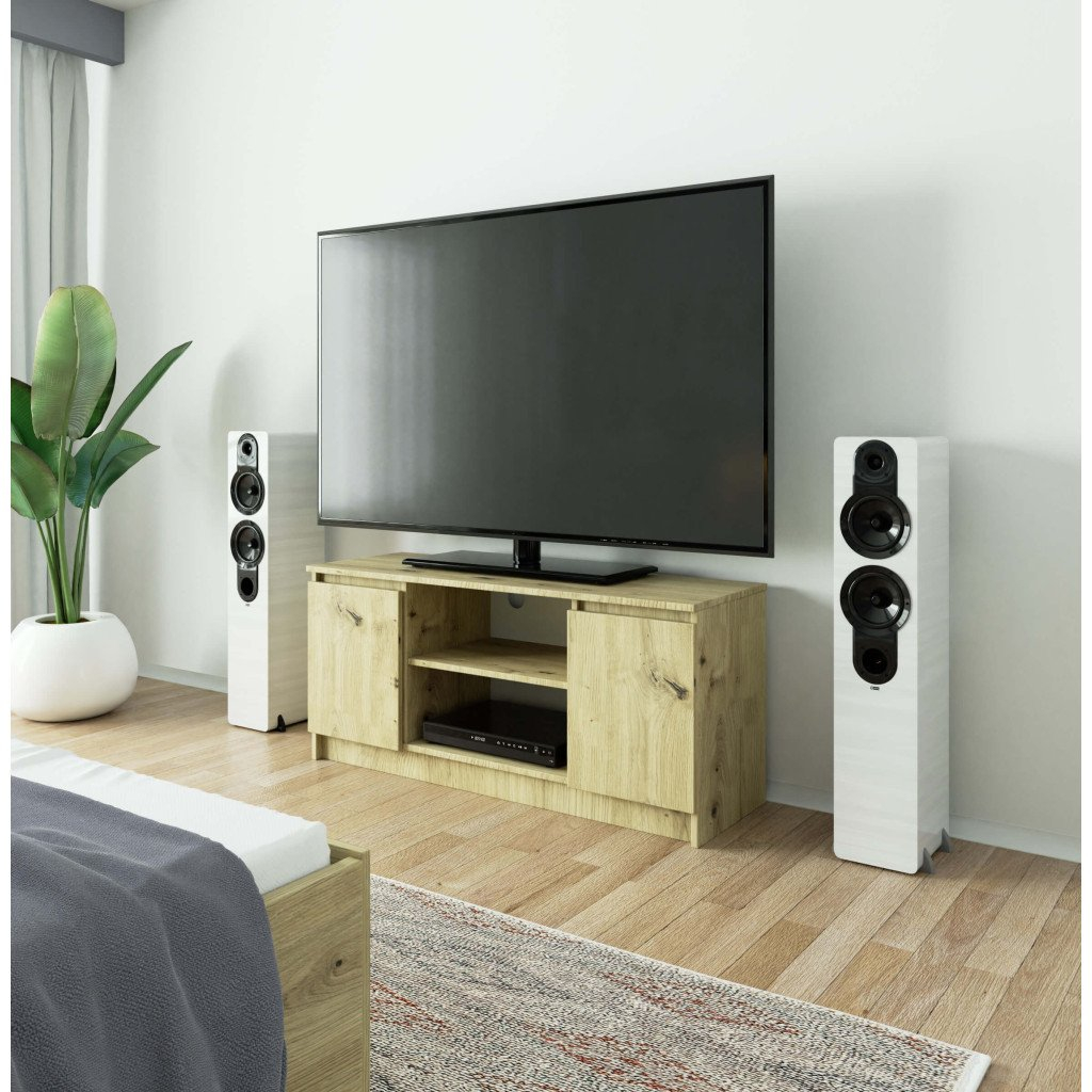 Comoda RTV realizata din PAL laminat durabil, cu doua usi pline si spatiu central cu polita pentru echipamente media, intr-un finisaj cald stejar artisan. O piesa eleganta si practica, ideala pentru living, dormitor sau orice zona multimedia.