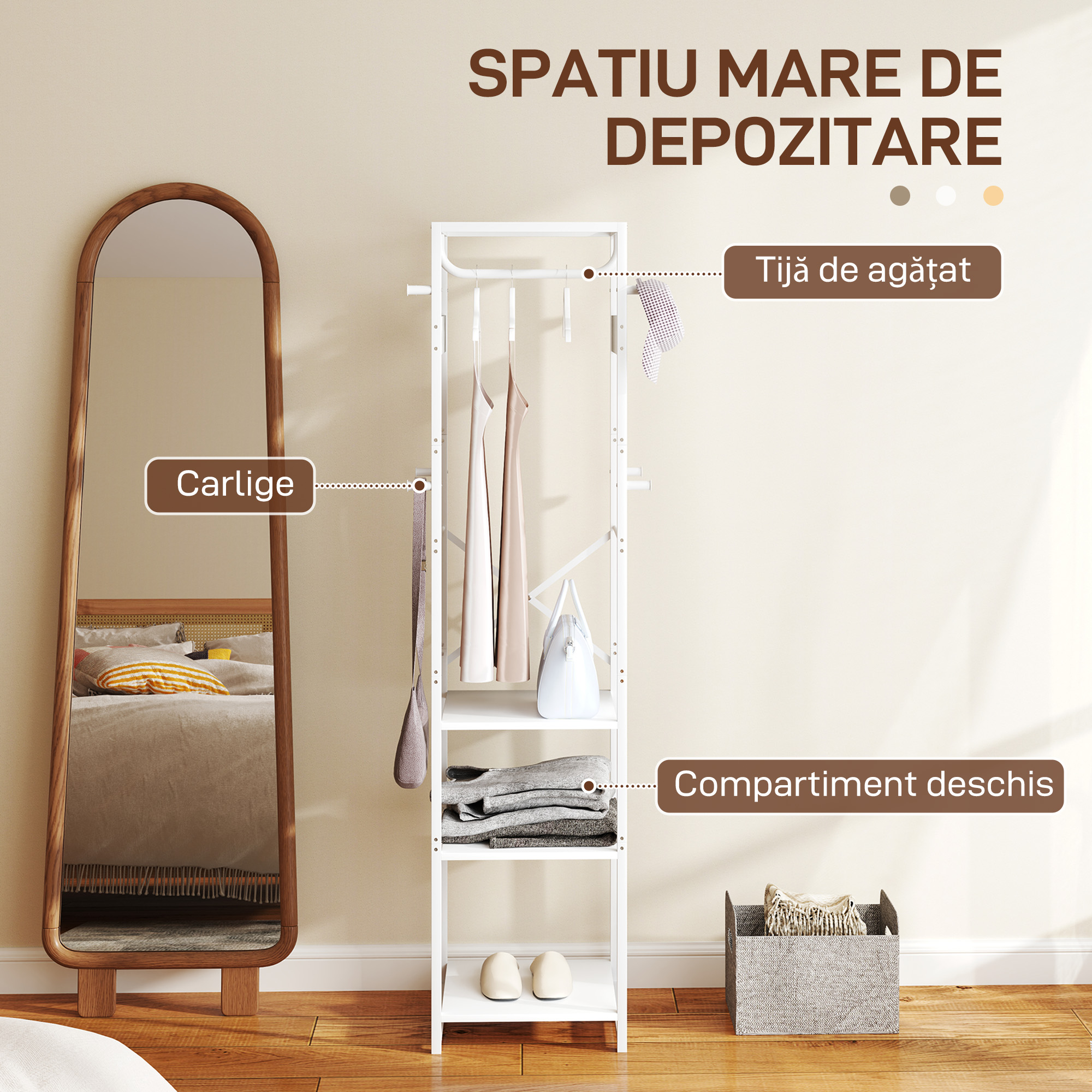 Reinnoieste-ti holul sau dormitorul cu un cuier de podea practic [BRAND NAME]. Acest model compact in stil industrial are o bara de 40 cm si un spatiu de agatare de 95 cm, plus doua rafturi deschise care permit combinarea stilului cu functionalitatea. Structura sa din otel robust cu finisaj pulverizat si stilul industrial sunt capabile sa decoreze orice incapere, mentinand intotdeauna hainele tale in ordine.