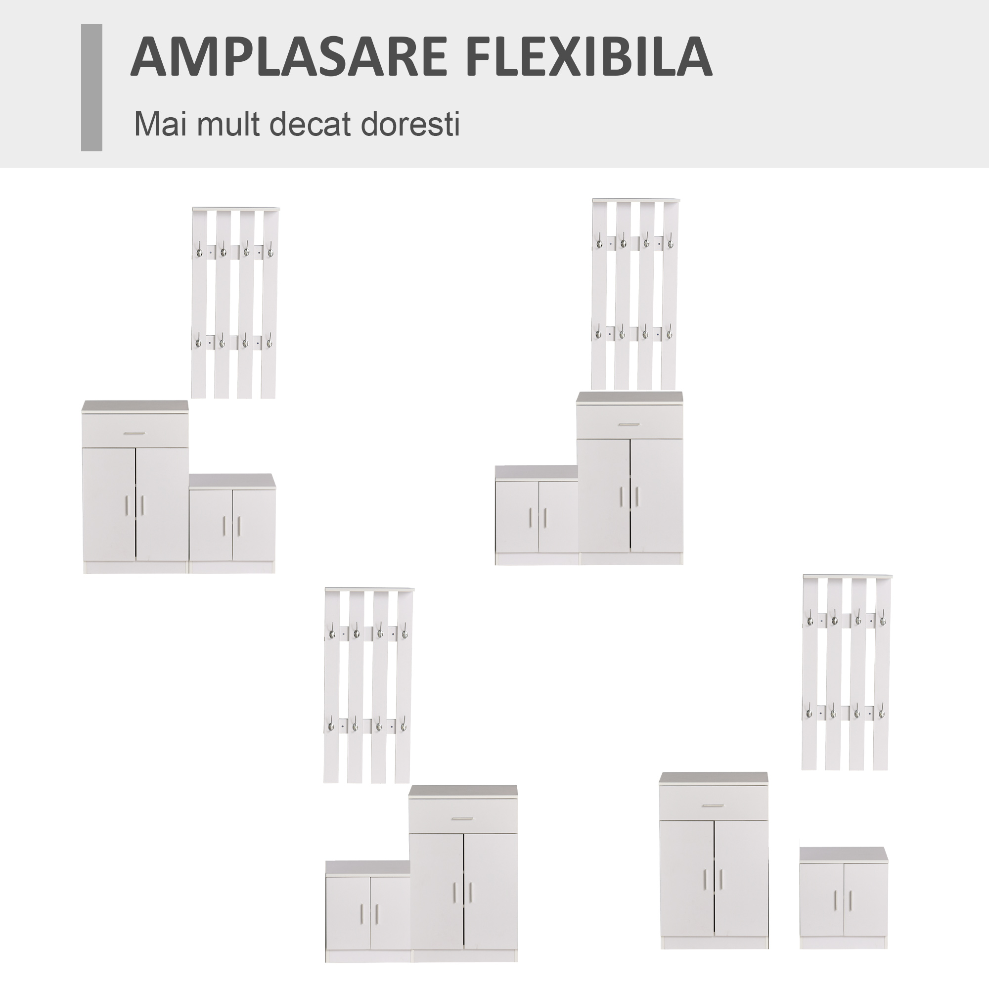 - ACCENT PRACTIC: Toatele componentele sunt accesibile la nivel optim: cuierul la inaltime, spatii deschise pentru obiecte frecvent utilizate si eventual oglinda la nivel vizual confortabil.