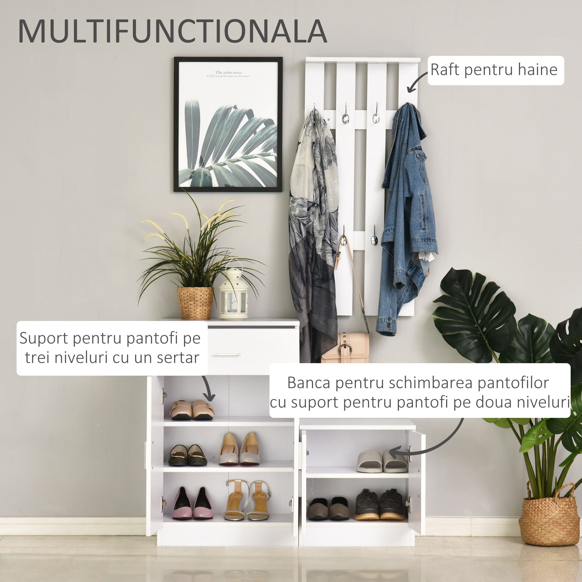 - DESIGN VERTICAL EFICIENT: Profilul inalt maximizeaza utilizarea spatiului pe verticala, perfect pentru holuri inguste. Designul elegant alb pastreaza ambientul luminos.