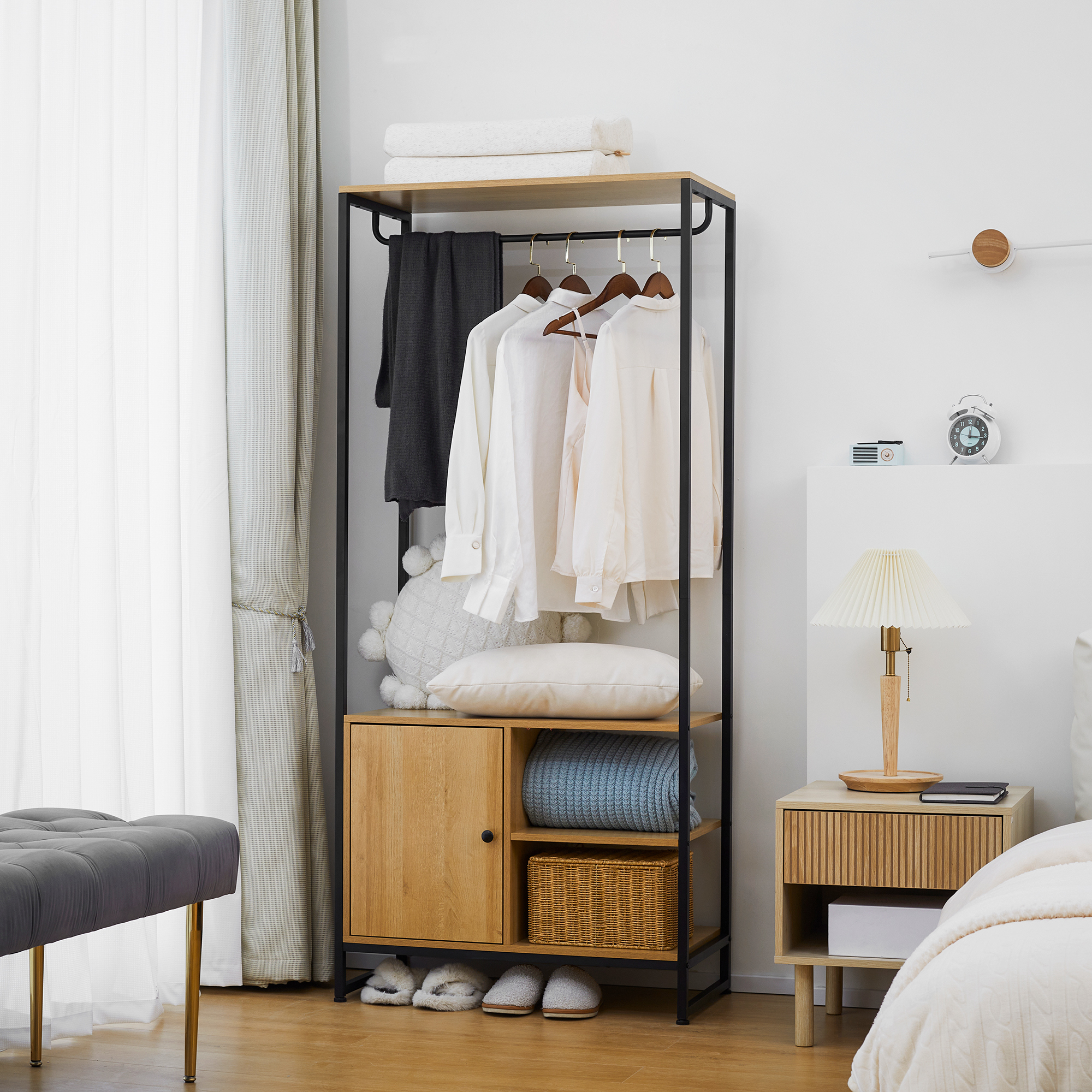 Asigurati-va casa ordonata si organizata cu acest suport pentru haine de la [BRAND NAME]. 1 sina pentru agatat paltoane, esarfe si genti. 4 rafturi deschise si 1 dulap inchis pentru cosuri de depozitare si vitrine. Pastrarea tuturor articolelor intr-o singura unitate. Placa aglomerata naturala combinata cu cadru de otel negru se va potrivi perfect cu orice stil de decor si va va placea sa o aveti ca parte a setului dvs. de mobilier. Elimina haosul din casa dvs. cu acest suport pentru haine.