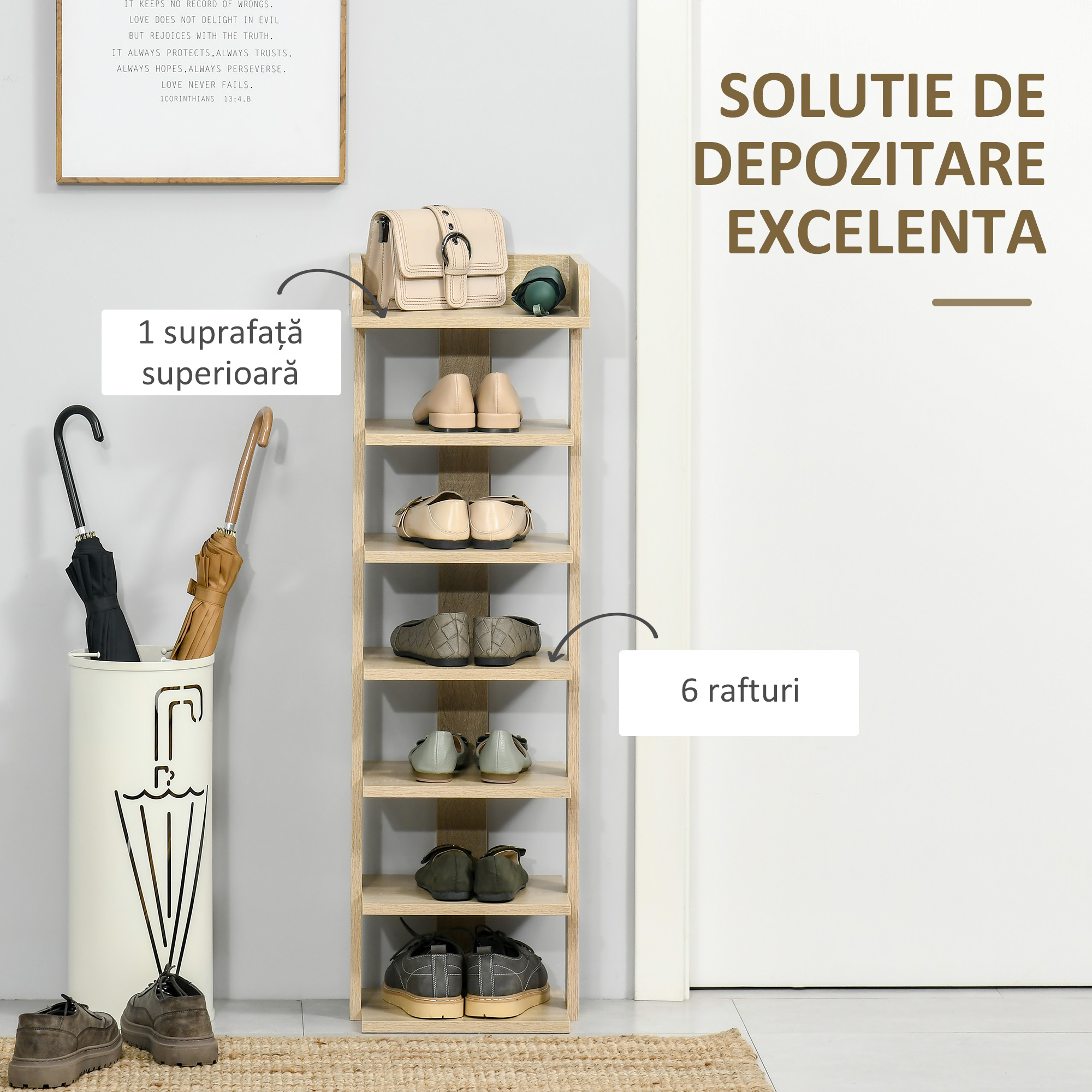 Este timpul sa-ti ordonezi pantofii cu acest raft pentru pantofi [BRAND NAME]! Designul simplu si modern face ca acest dulap modern pentru pantofi sa fie perfect pentru diferite medii. Cu cele 6 rafturi practice, iti permite sa-ti tii pantofii la indemana, iar etajul superior ofera un spatiu confortabil pe care sa-ti pastrezi obiectele zilnice. Acest dulap pentru pantofi care economiseste spatiu este perfect pentru camerele mici si in fiecare colt al casei tale, de la dormitor la hol.