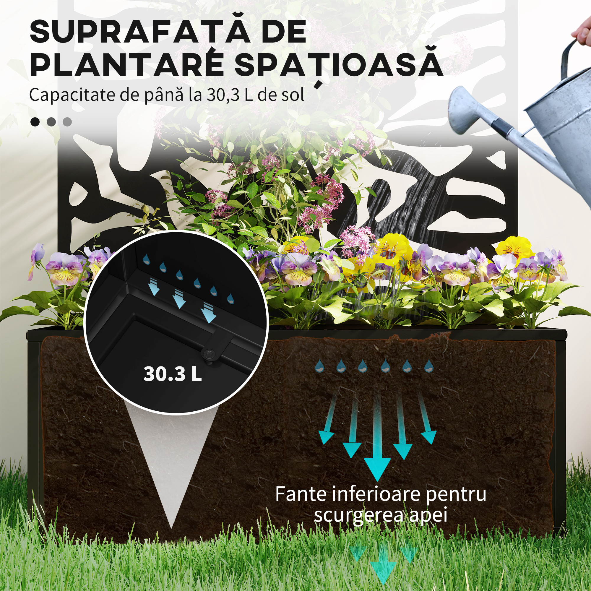 Acest ecran de intimitate include un ghiveci cu grilaj la baza, oferind stabilitate suplimentara si servind ca o alternativa decorativa atractiva. Este perfect pentru plantarea legumelor, ierburilor si florilor, creand spatii private fermecatoare. Ghiveciul cu grilaj poate fi montat si pe perete, daca se doreste.