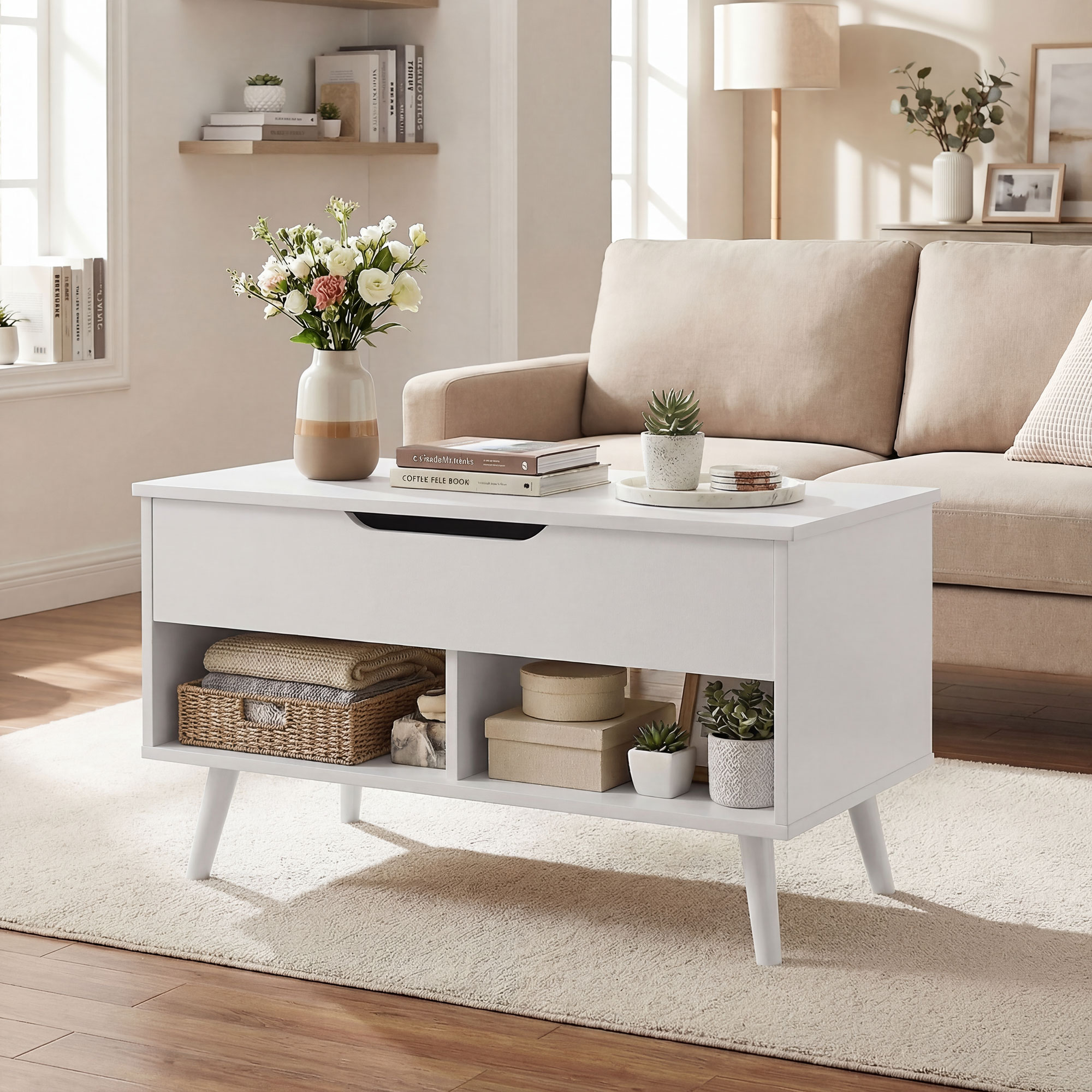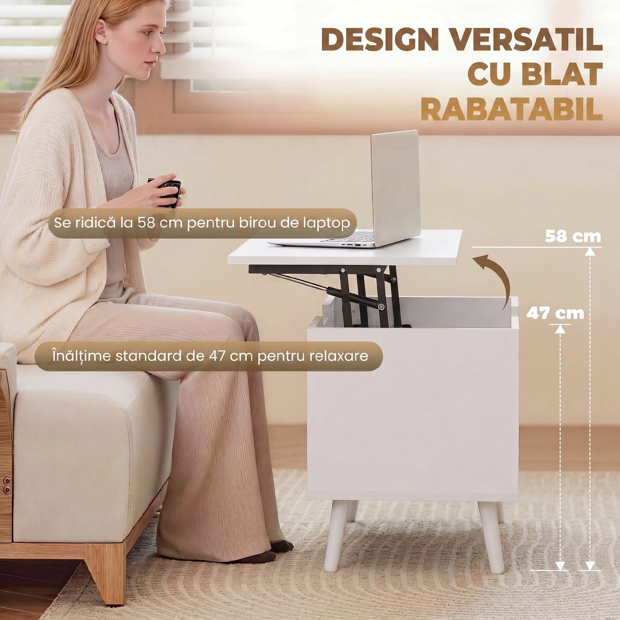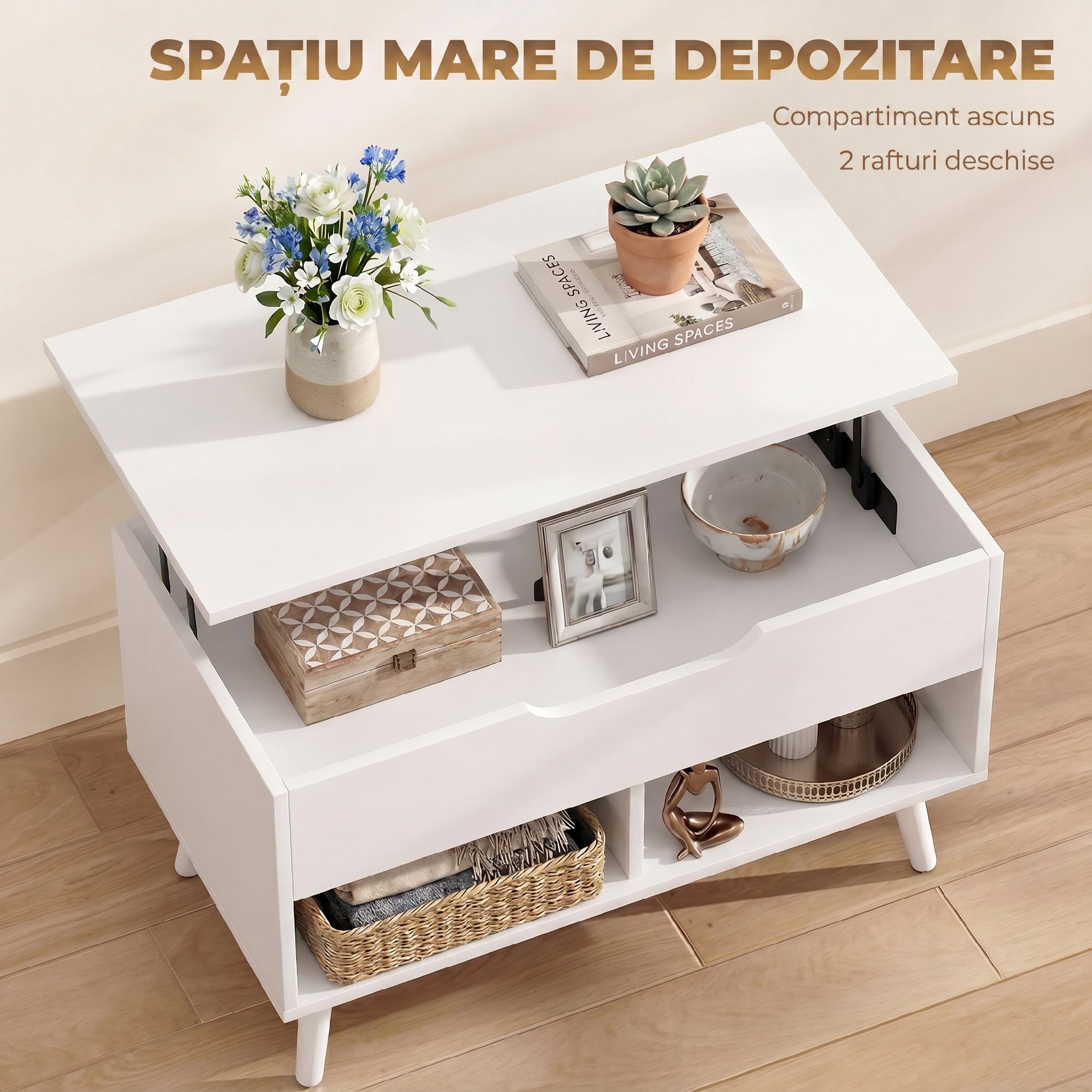 Dezordinea de pe masa de cafea face livingul sa para ingust si stresant. Masa de cafea [BRAND NAME] cu blat rabatabil de la 47 cm la 58 cm ofera o suprafata confortabila pentru lucru sau masa. Cu un compartiment ascuns si rafturi deschise, organizeaza obiectele esentiale, combinand practicitatea cu stilul industrial pentru livingul tau modern.