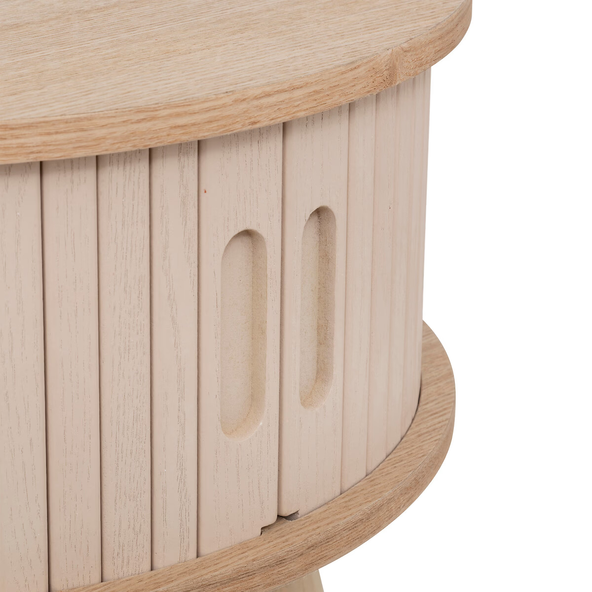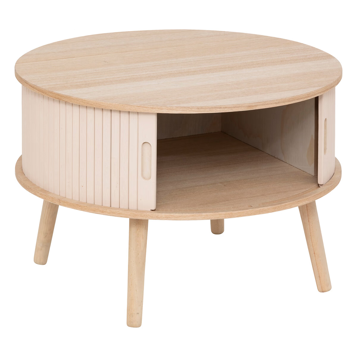 Atmosphera Nysos este o masuta de cafea rotunda si functionala, cu usi glisante si raft interior. Ideala pentru livinguri mici sau moderne, combina finisajele naturale cu detalii grafice discrete. Blatul din lemn si fronturile crem aduc un contrast placut si un aer scandinav.