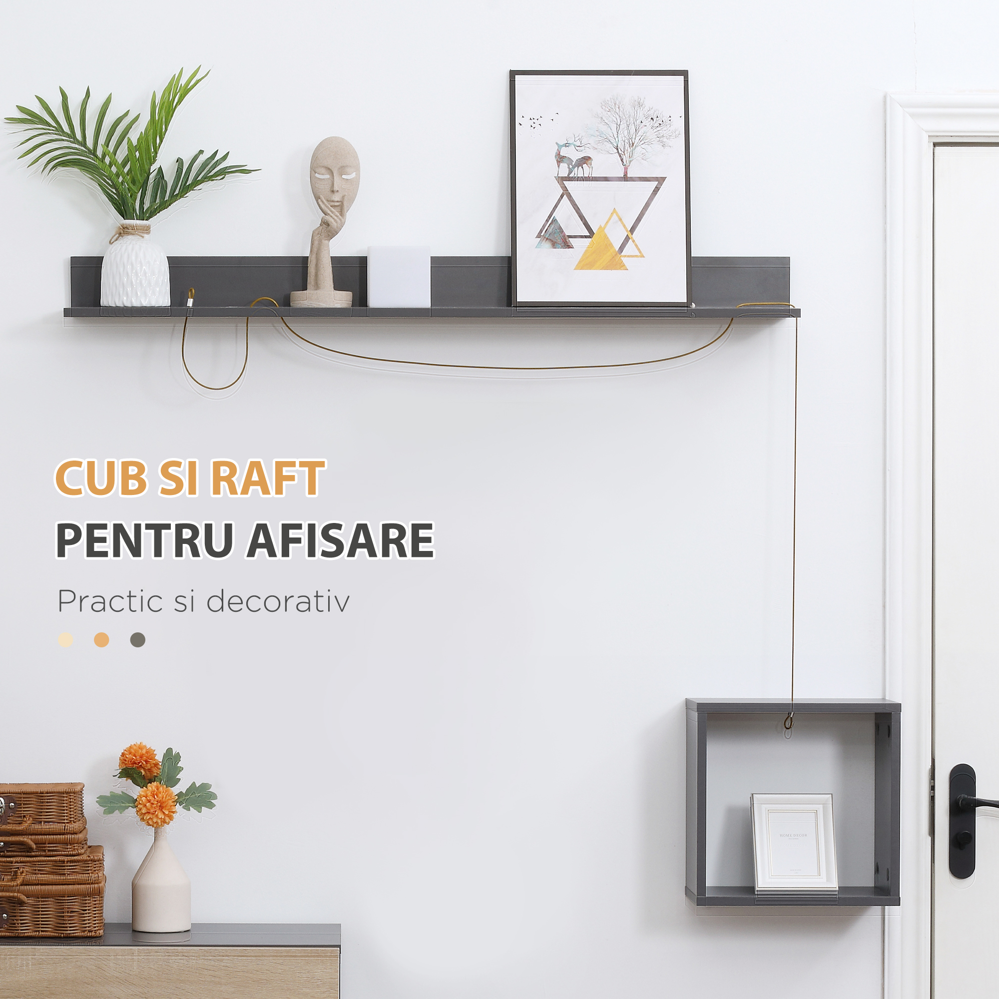 - RAFT MONTAT PE PERETE: Zona superioara a raftului si cubul suspendat sunt folosite pentru depozitare decorativa. Folositi acest spatiu pentru a afisa fotografii si o planta in ghiveci