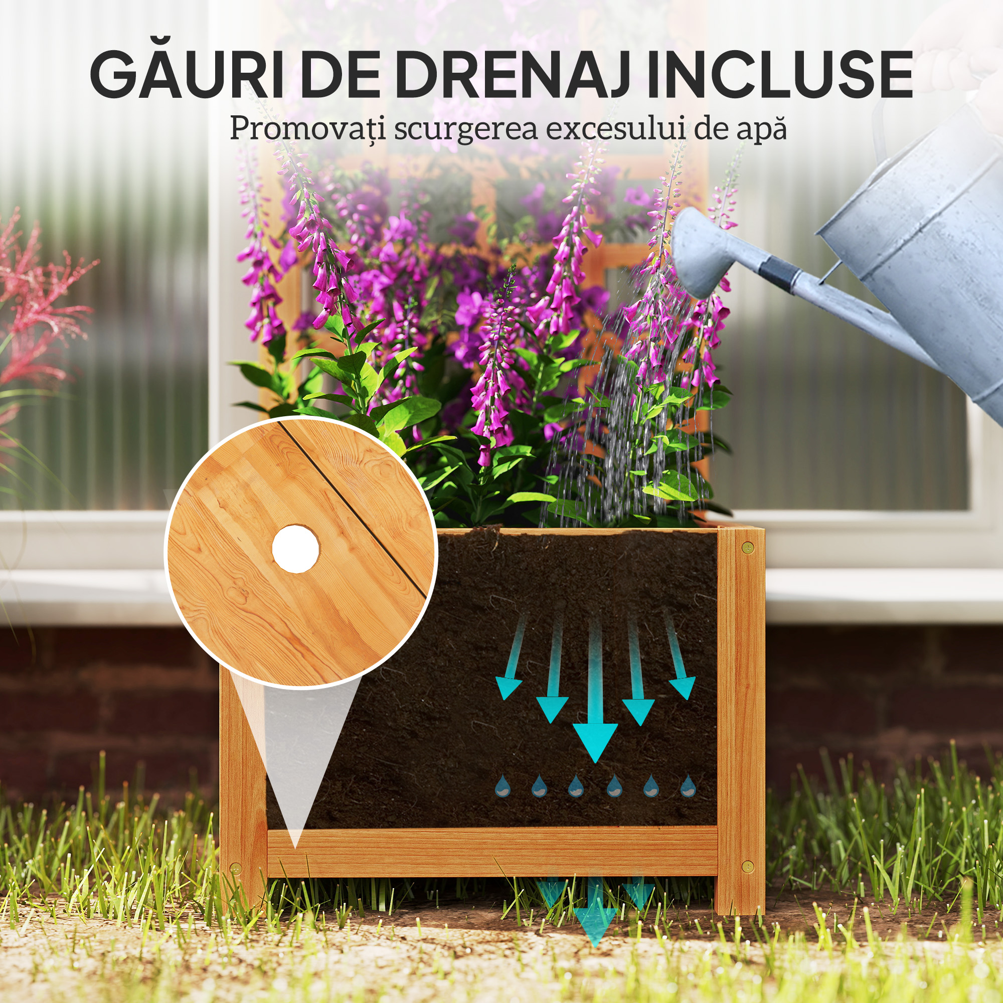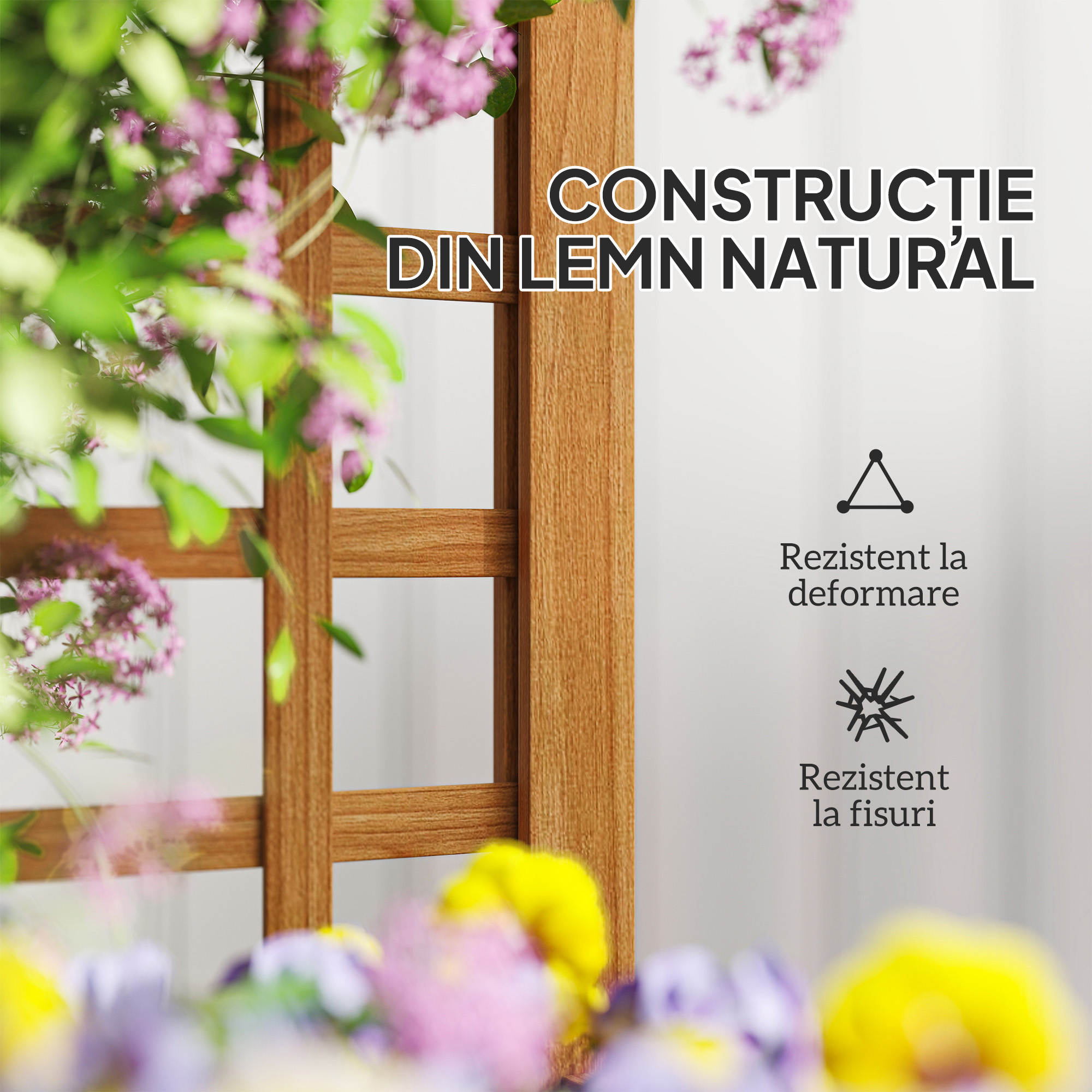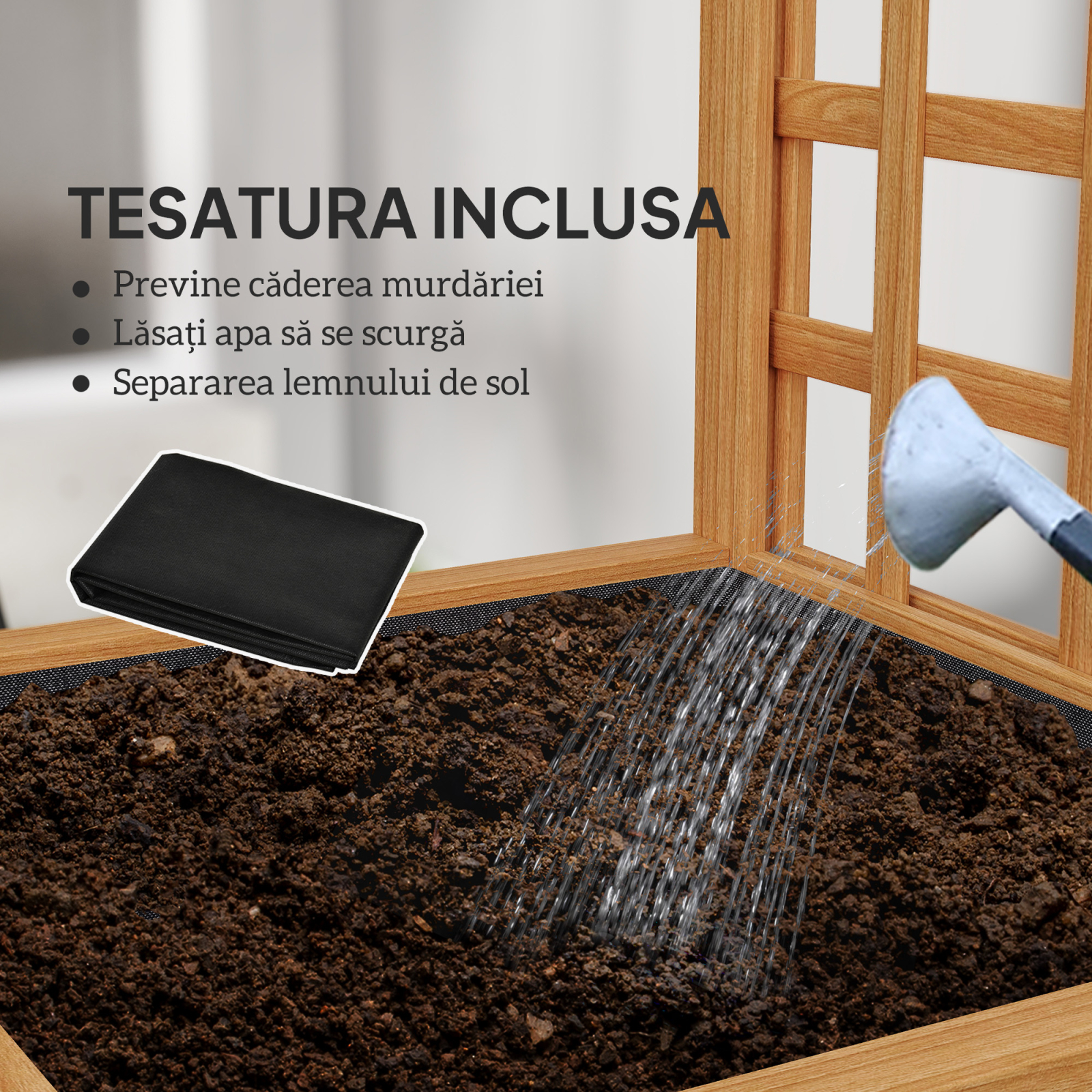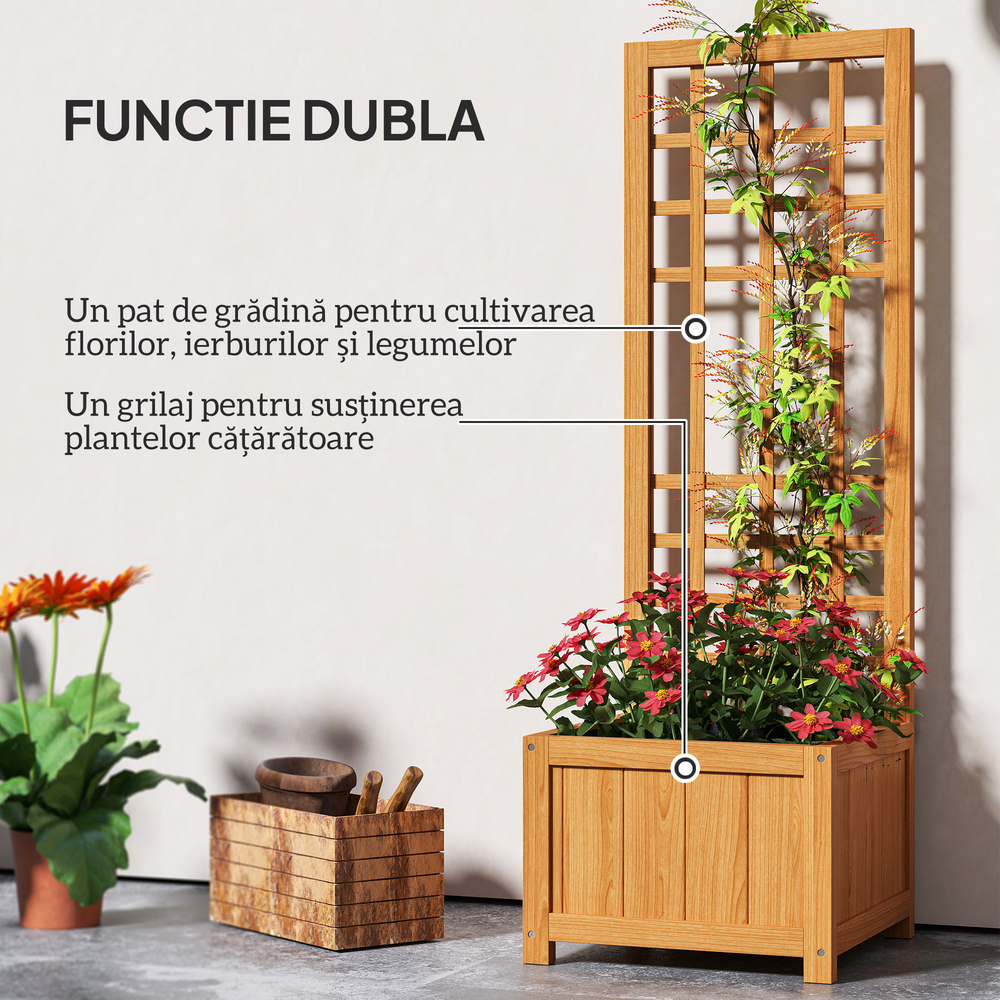 Transforma un spatiu exterior mic intr-o incantatoare gradina verticala cu jardiniera noastra cu spalier [BRAND NAME]. Aceasta structura eleganta inaltata combina un spalier cu o jardiniera din lemn natural de brad, vopsit cu o vopsea impermeabila pentru a rezista la intemperii. O captuseala respirabila inclusa previne daunele cauzate de apa si deteriorarea radacinilor, asigurandu-se ca plantele tale continua sa creasca!