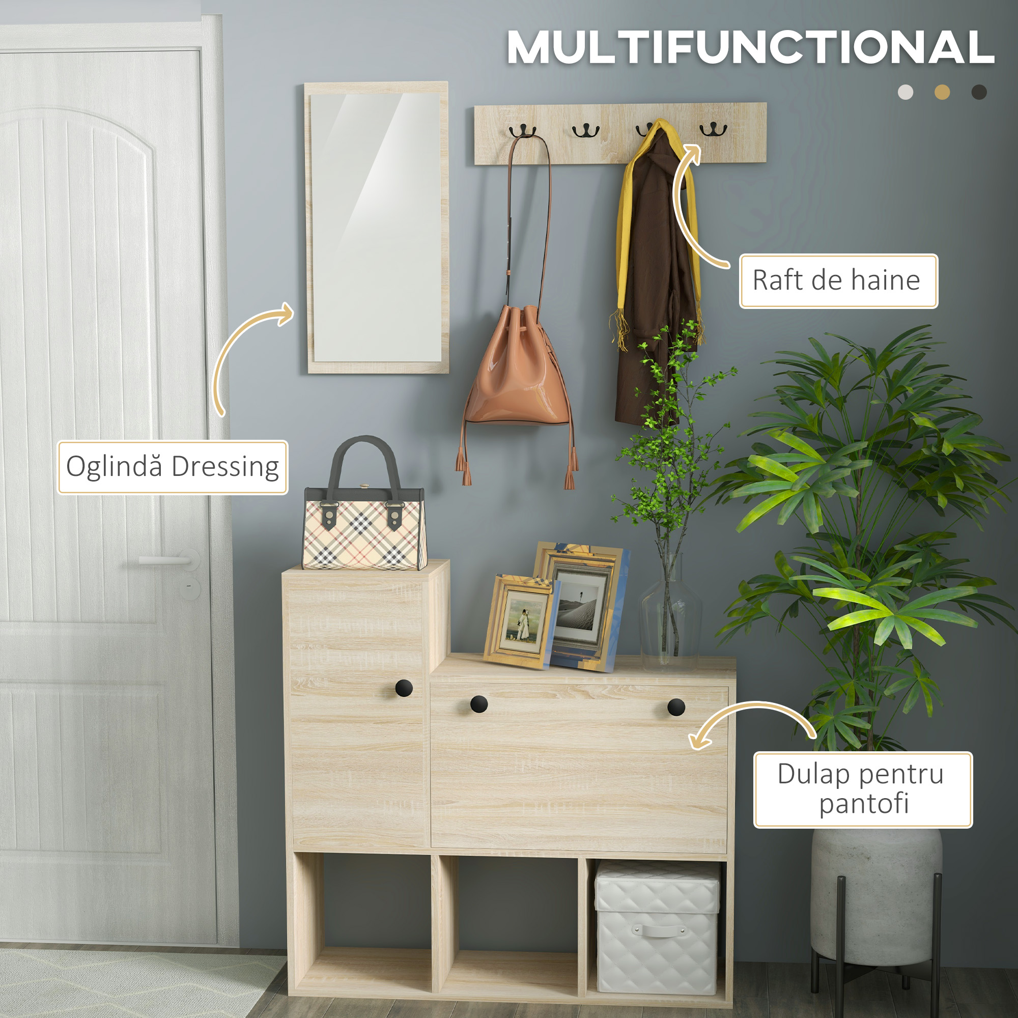 Acest set [BRAND NAME] include un pom de hol cu carlige, o banca confortabila si un organizator pentru 9 perechi de pantofi. Designul compact economiseste spatiu si ofera solutia completa pentru intrari moderne. Structura stabila si rafturile bine gandite mentin ordinea zilnica. Este ideal pentru apartamente si locuinte cu holuri mici.