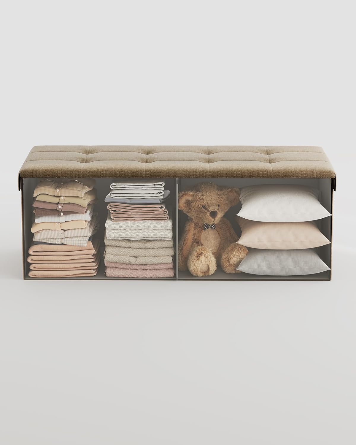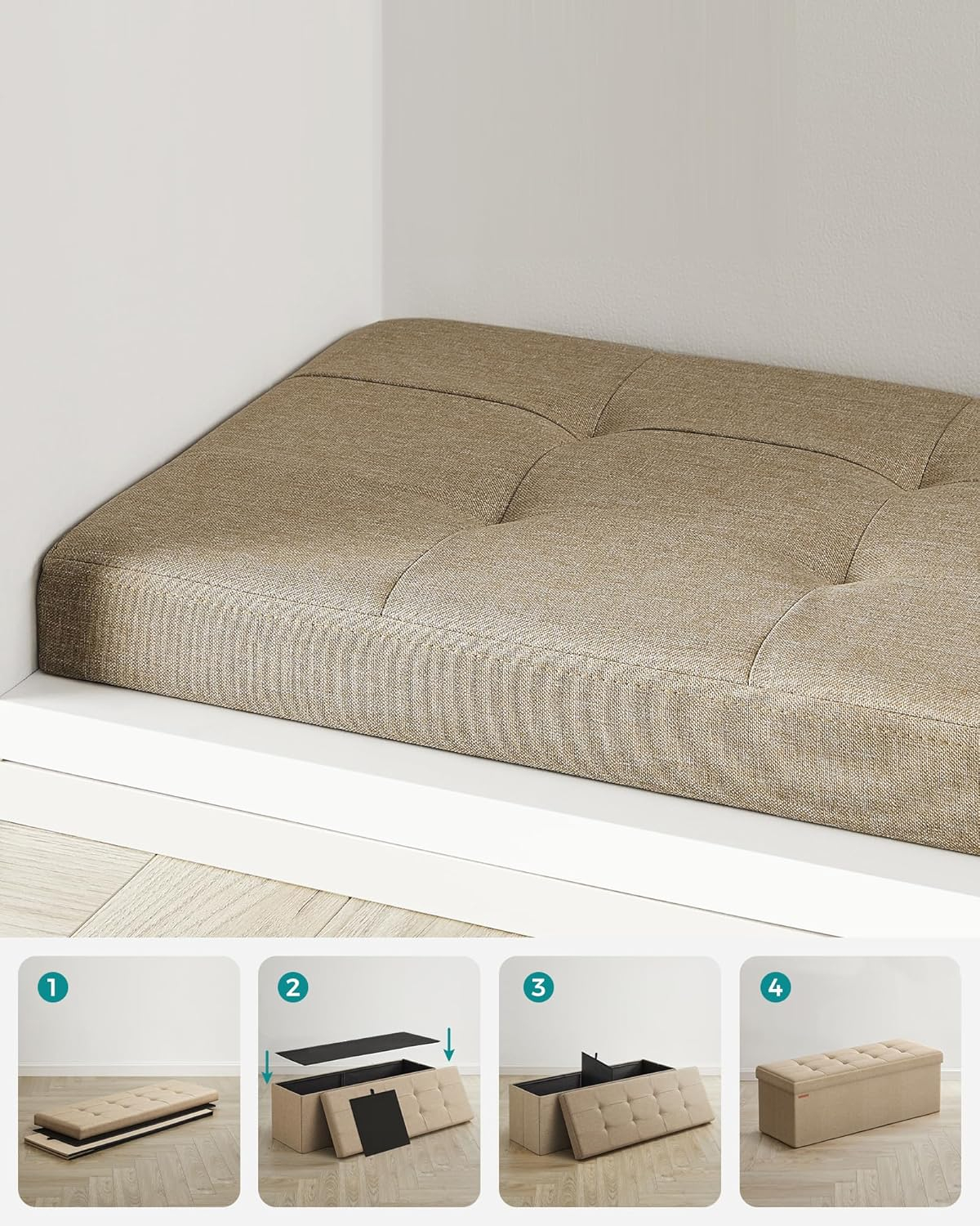 bancheta pliabila cu spatiu de depozitare 110x38x38 cm, MDF si material textil, capacitate 300 kg, maro camel
