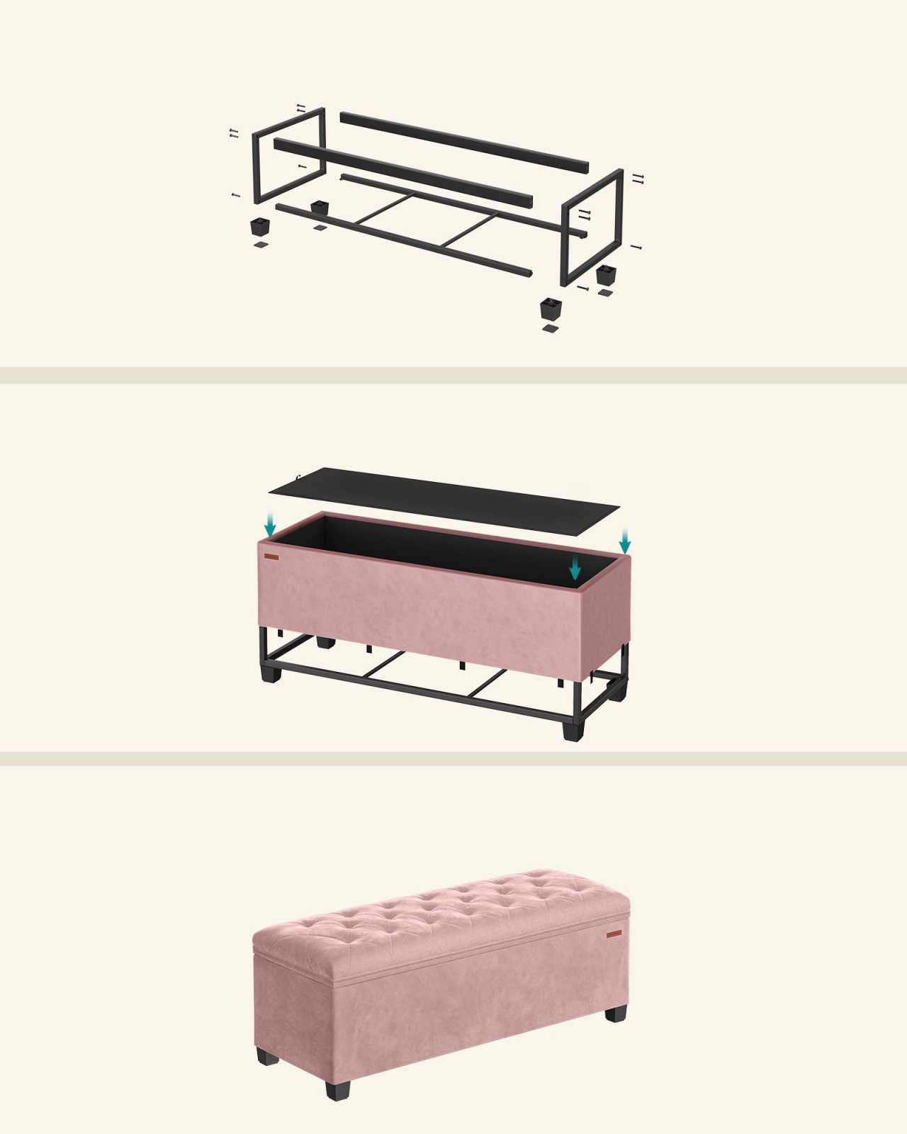 Aceasta bancuta SONGMICS cu finisaj catifelat adauga o nota sofisticata oricarui spatiu. Cu un design matlasat, picioare elegante si un interior spatios de 103 litri, este ideala pentru depozitare si relaxare, fara a necesita asamblare.