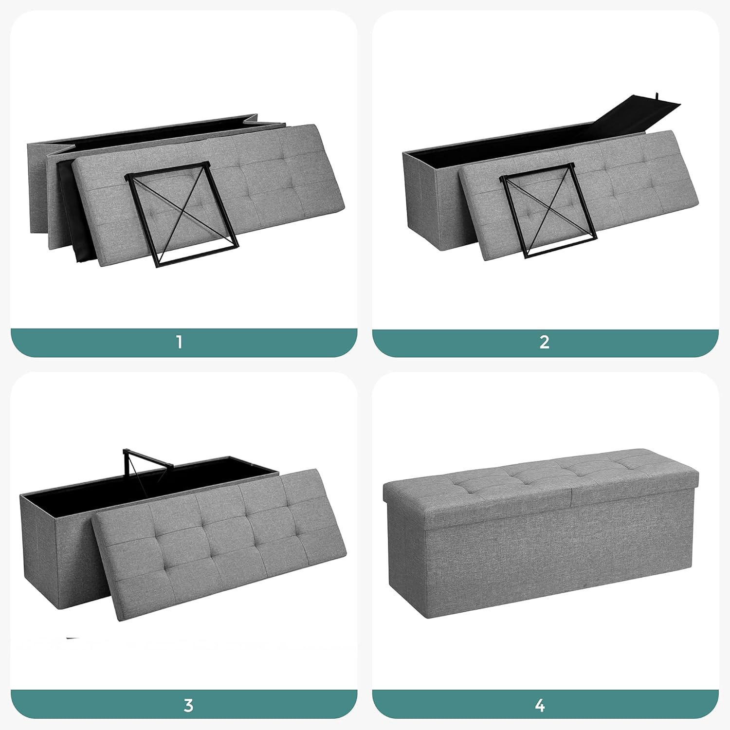 Aceasta bancuta pliabila de la SONGMICS ofera un echilibru perfect intre design modern si functionalitate. Cu un capac dublu rabatabil si spatiu interior de 120L, este ideala pentru depozitarea lenjeriei, hainelor sau cartilor, oferind totodata un loc confortabil de stat.