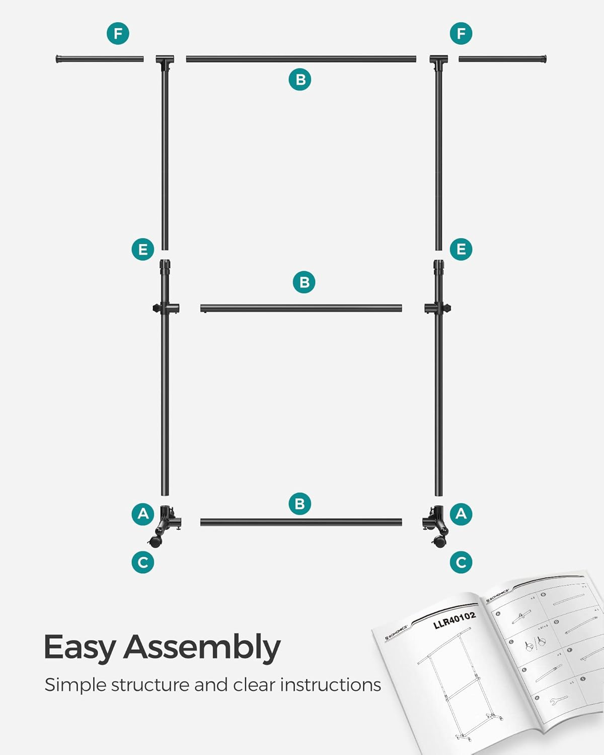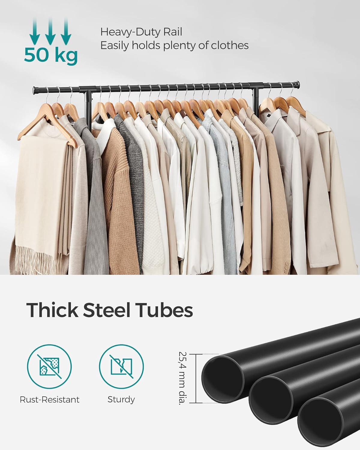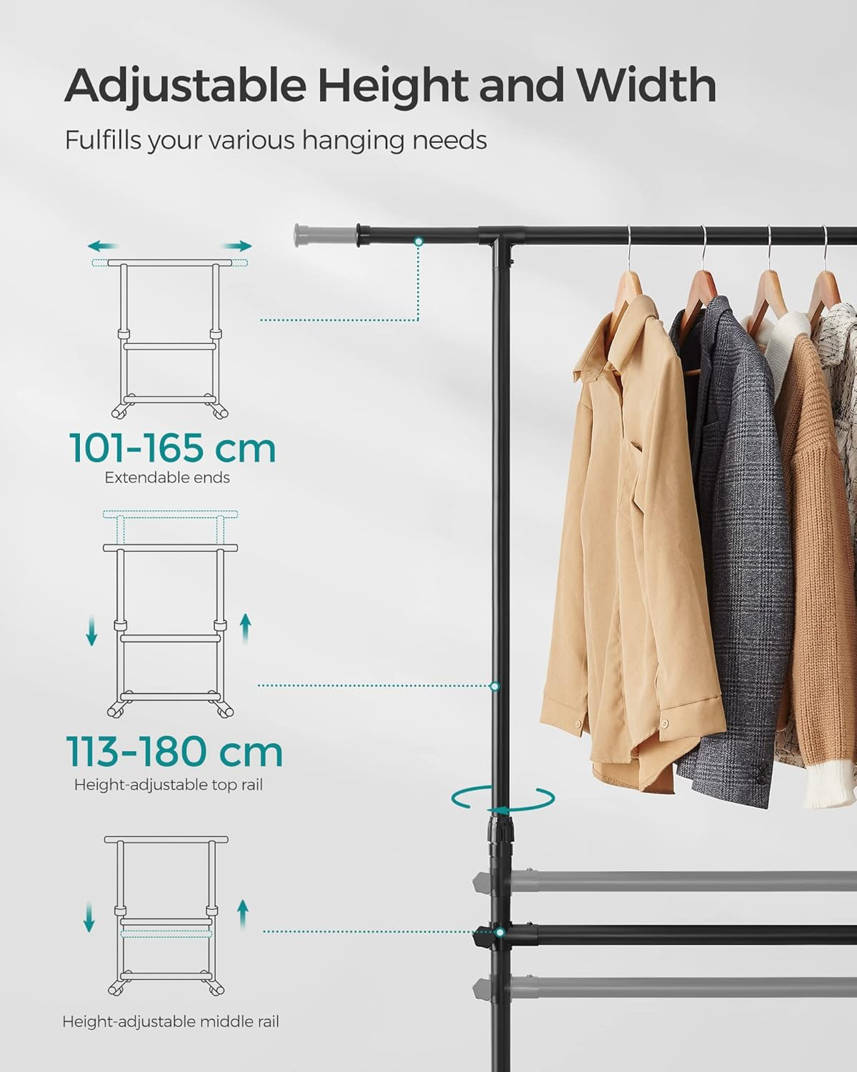 Suportul de haine SONGMICS cu doua bare este solutia ideala pentru organizarea eficienta a hainelor intr-un spatiu redus. Designul reglabil permite adaptarea pentru articole de diferite lungimi, iar rotile il fac usor de mutat intre incaperi.