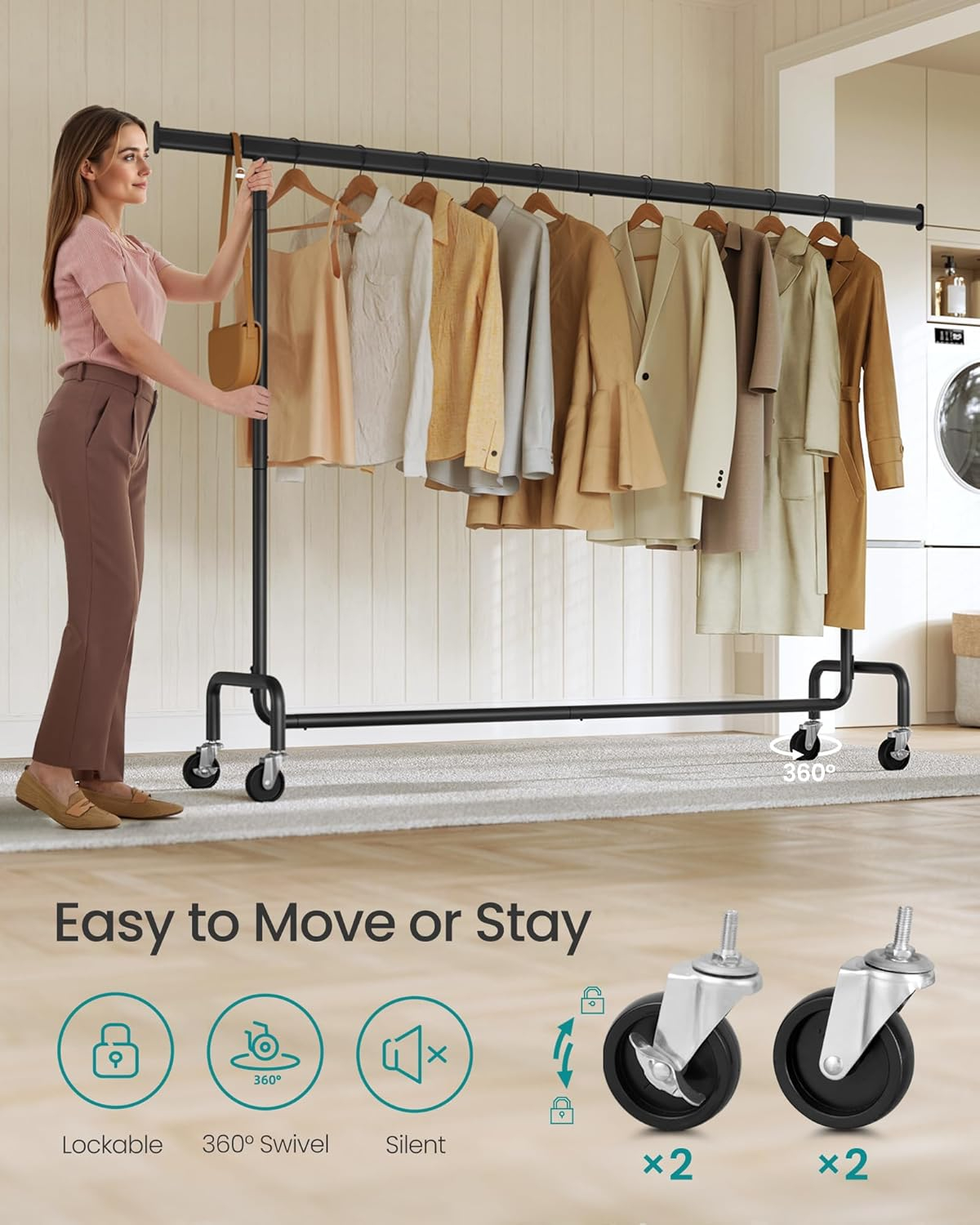Suport pentru haine cu bara extensibila si roti industriale, gandit pentru incarcari mari. Se muta usor intre camera, dressing si spalatorie, iar franele il fixeaza stabil cand ai nevoie.
