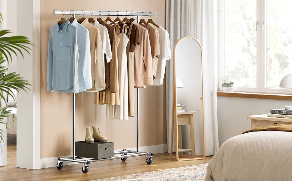 Specificatii: Culoare: Argintiu Material: otel, roti din PP Dimensiune produs: 45,4 x (92-132) x 160 cm (A x L x A) Greutate produs: 5 kg Max. Capacitate de sarcina statica: 90 kg Continutul pachetului: 1 x Suport pentru haine, 1 x Instructiuni Despre acest articol Capacitate de incarcare sporita: Datorita tuburilor de otel cu grosimea de 1 mm, care sunt mai groase si mai rezistente decat cele normale, cu grosimea de 0,8 mm, si rotilor din PP rezistente, acest suport pentru haine suporta pana la 90 kg. Asa ca nu ezitati sa va atarnati paltoanele grele!Sina de suspendare extensibila: Fiecare capat al sinei superioare se extinde cu inca 20 cm pentru a va oferi mai mult spatiu pentru agatat (sina de sus se extinde de la 92 cm la 132 cm); cele 2 capete extensibile sunt, de asemenea, ideale pentru a agata gentile, palariile, esarfele sau alte accesorii peUsor de mutat si blocat: aceasta sina pentru haine este dotata cu 4 roti pivotante la 360°, dintre care 2 se pot bloca, permitandu-va sa o mutati cu usurinta din dormitor in garderoba si sa o blocati pe loc daca este necesar.Usor de asamblat si depozitat: Nu sunt necesare instrumente pentru a configura aceasta sina de imbracaminte si poate fi gata in doar 3 pasi! Cand nu este folosit, il puteti dezasambla si pune deoparte sub pat sau intr-un colt nefolosit rapid pentru a economisi spatiuUtilizare versatila: Aceasta bara pentru haine vine cu 2 bare inferioare pentru cutiile de depozitare, facandu-l functional, fie in dormitor sau in garderoba pentru a depozita articolele zilnice, fie in spalatorie pentru a usca hainele. Otelul acoperit cu pulbere permite, de asemenea, utilizarea in exterior