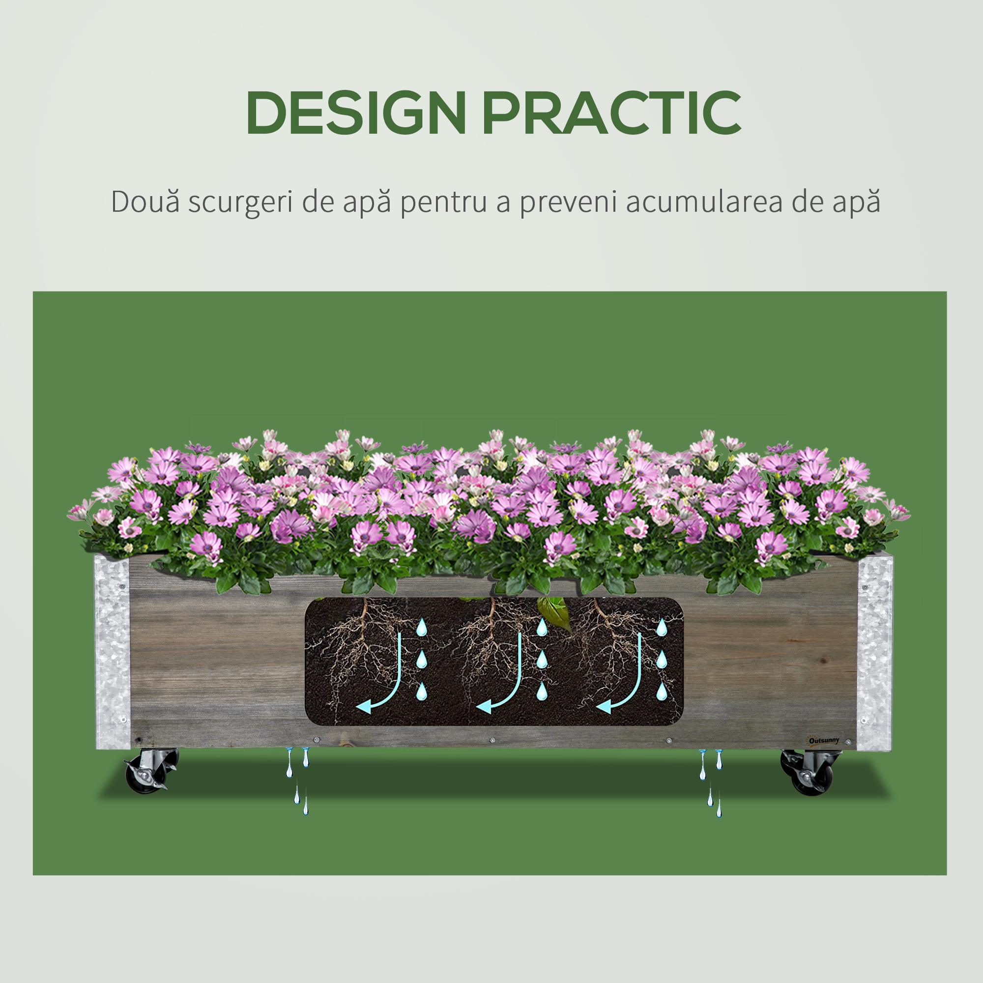 Aceasta jardiniera eleganta, dreptunghiulara, din molid gri, este ideala pentru cultivarea legumelor, ierburilor aromatice sau florilor. Cu un design compact si elegant, se potriveste perfect pe balcoane, terase, curti sau gradini. Echipata cu 4 roti, sisteme de irigare si un material textil care asigura scurgerea apei, aceasta jardiniera de exterior este esentiala pentru orice pasionat de gradinarit!