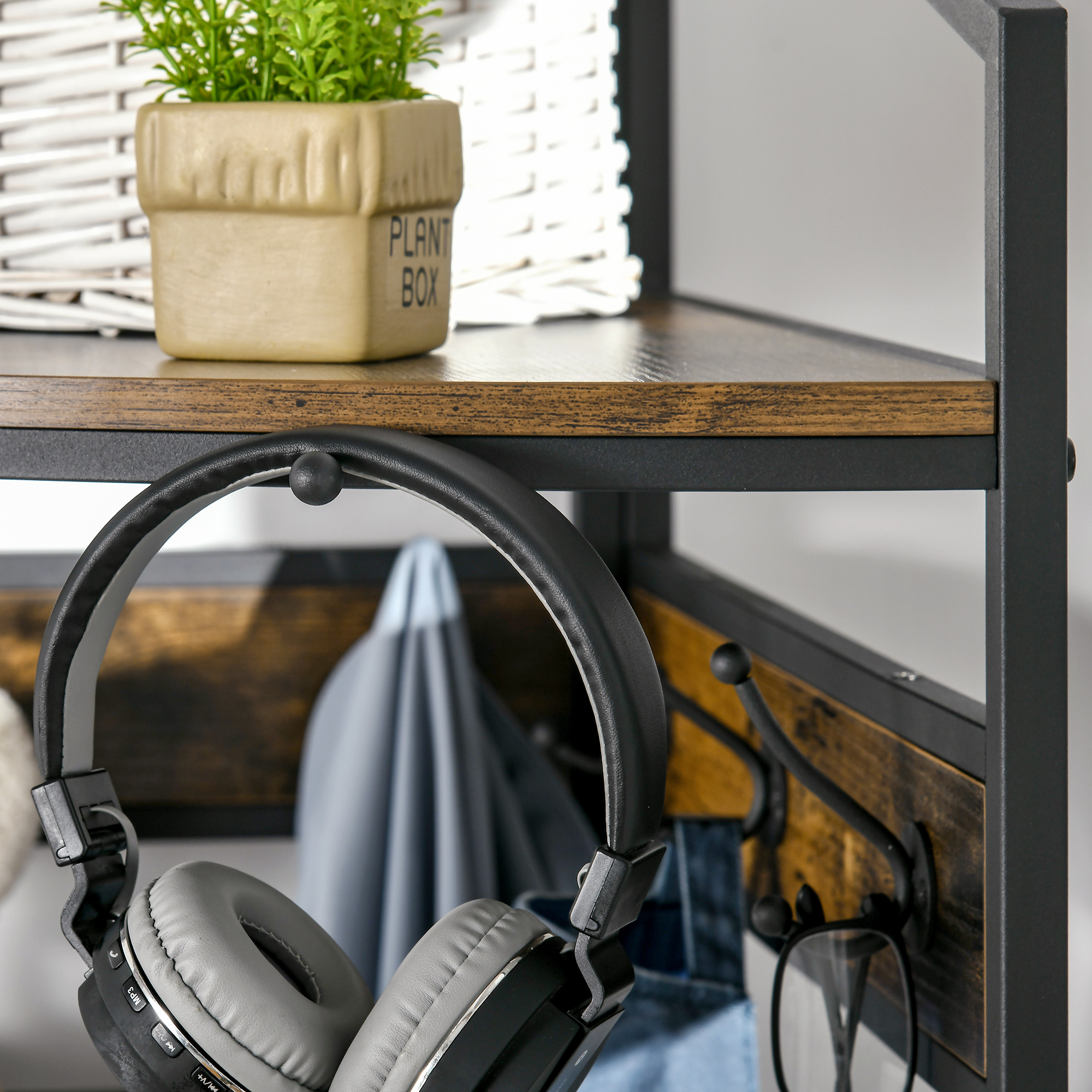 Pastreaza holul ordonat cu suportul pentru haine [BRAND NAME]. Fiecare jacheta, palton si esarfa isi va gasi locul datorita carligelor duble si designul-ui sau unghiular se potriveste in orice spatiu. Are o banca practica cu suport pentru pantofi, astfel incat sa te poti aseza confortabil oricand trebuie sa te incalti sau descalti. Fabricat din otel si lemn in stil industrial, acest suport pentru haine pentru hol se potriveste cu diferite stiluri de mobilier.