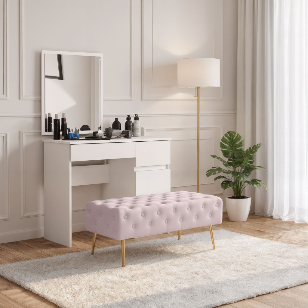 Pufa tapitata cu velur moale este un element elegant pentru interioare sofisticate. Textura fina si finisajele atent realizate ofera un plus de rafinament, iar picioarele metalice asigura stabilitate si rezistenta. Potrivita ca banca, suport sau accent decorativ in living, dormitor sau hol.