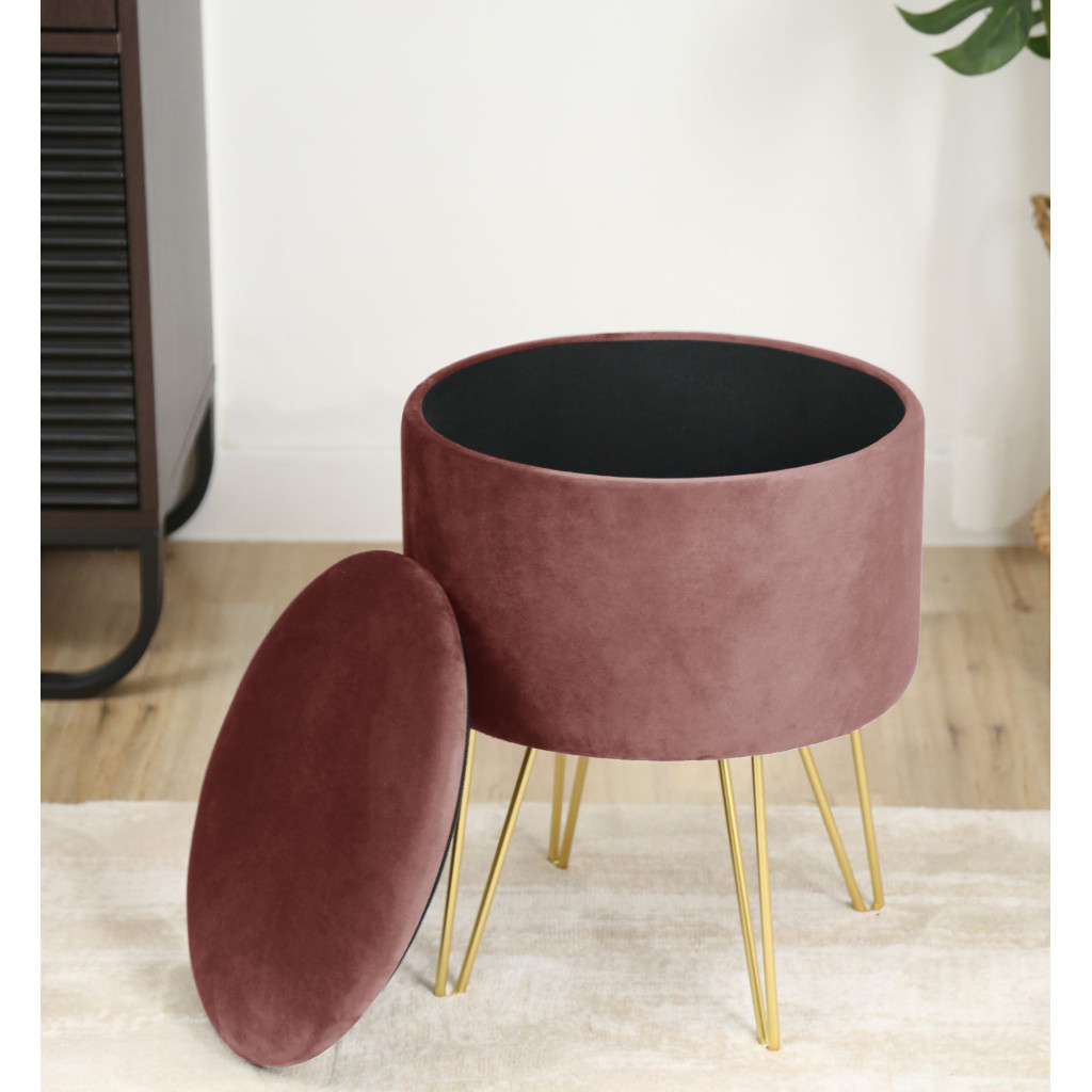 Taburetul tapitat Lili este un element practic si decorativ, ideal pentru living sau dormitor. Tapiteria din welur ofera un aspect elegant si o senzatie placuta la atingere, iar picioarele metalice aurii adauga un accent modern glam. Spatiul de depozitare ascuns sub sezut permite pastrarea organizata a obiectelor mici, fara a incarca vizual incaperea.