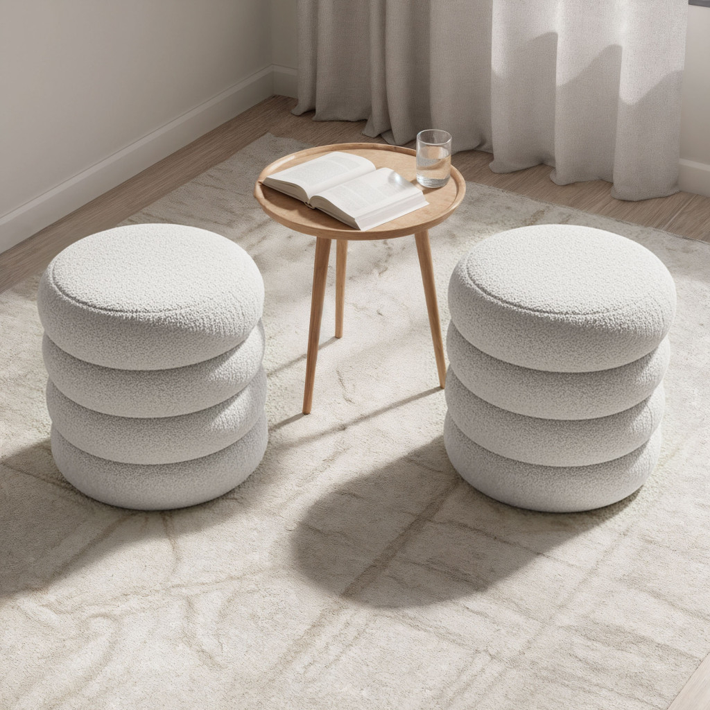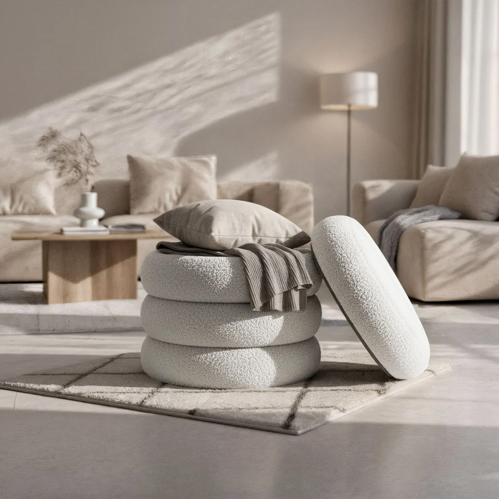 Pufa rotund cu tapiterie teddy imbina designul elegant cu functionalitatea practica. Textura moale si pufoasa ofera confort sporit, iar lada de depozitare ascunsa sub capac este ideala pentru paturi, perne sau alte accesorii. O alegere potrivita pentru living, dormitor sau hol.