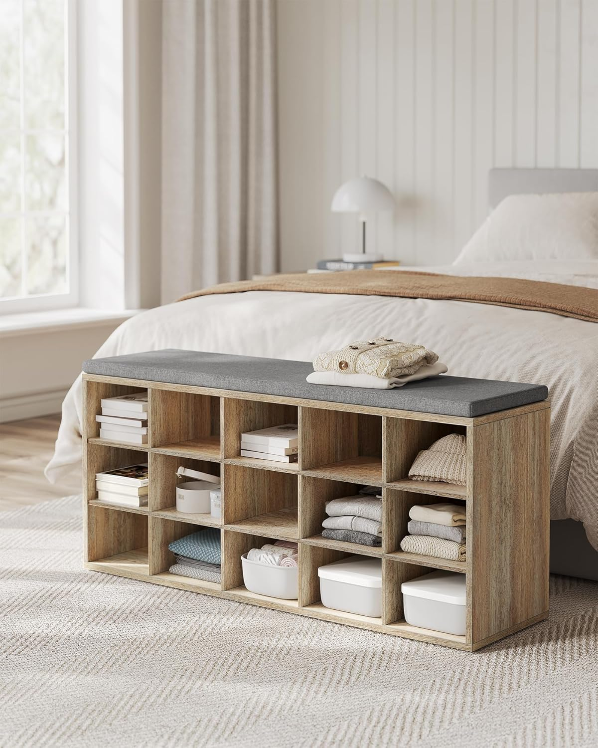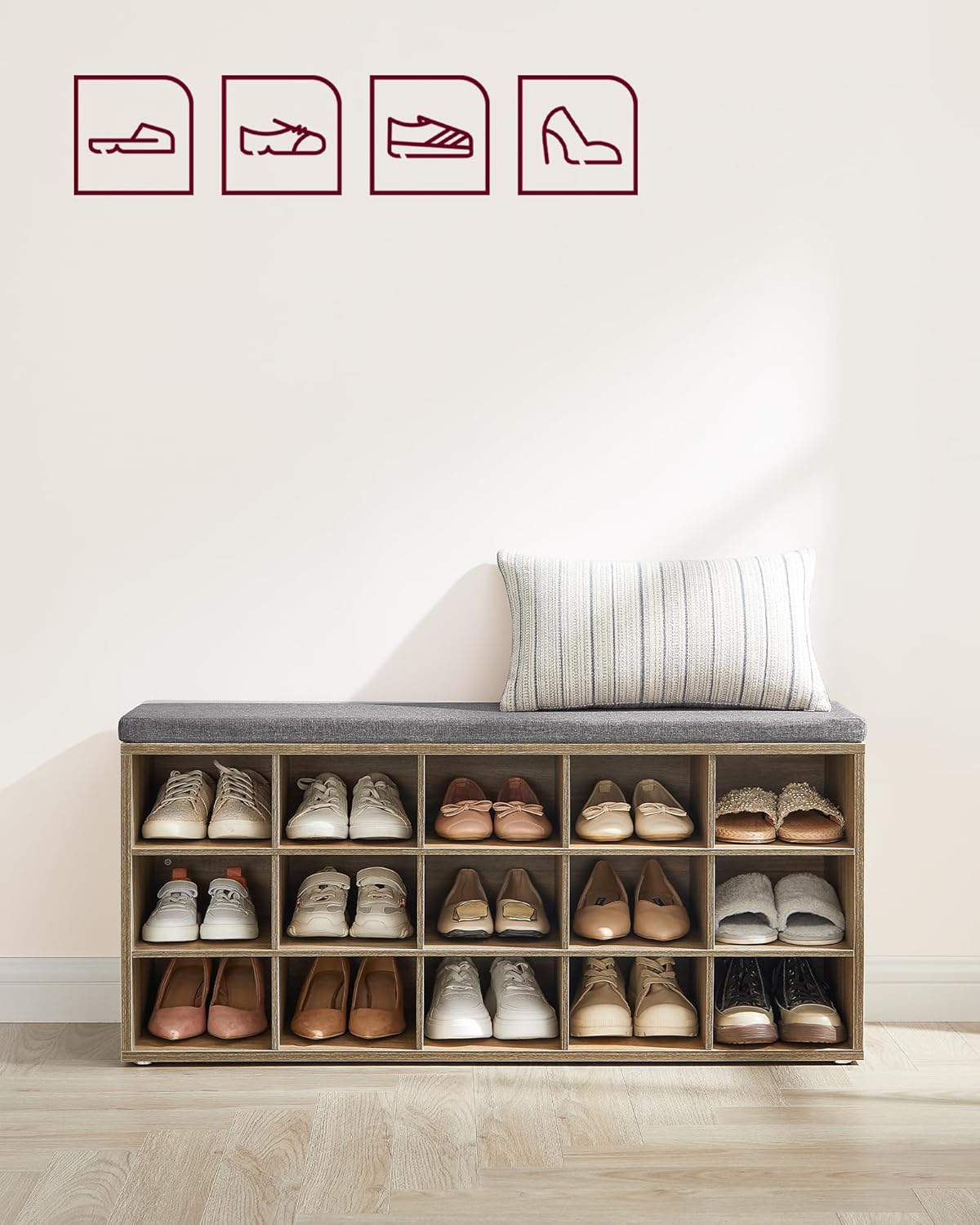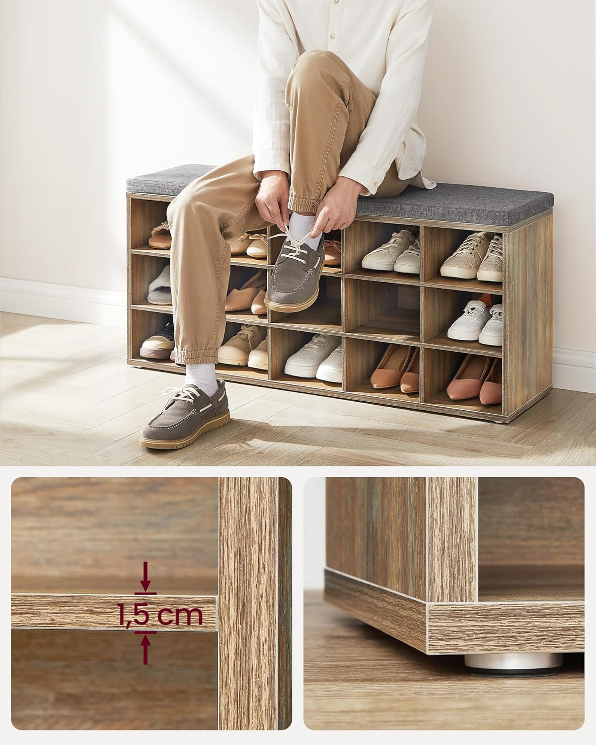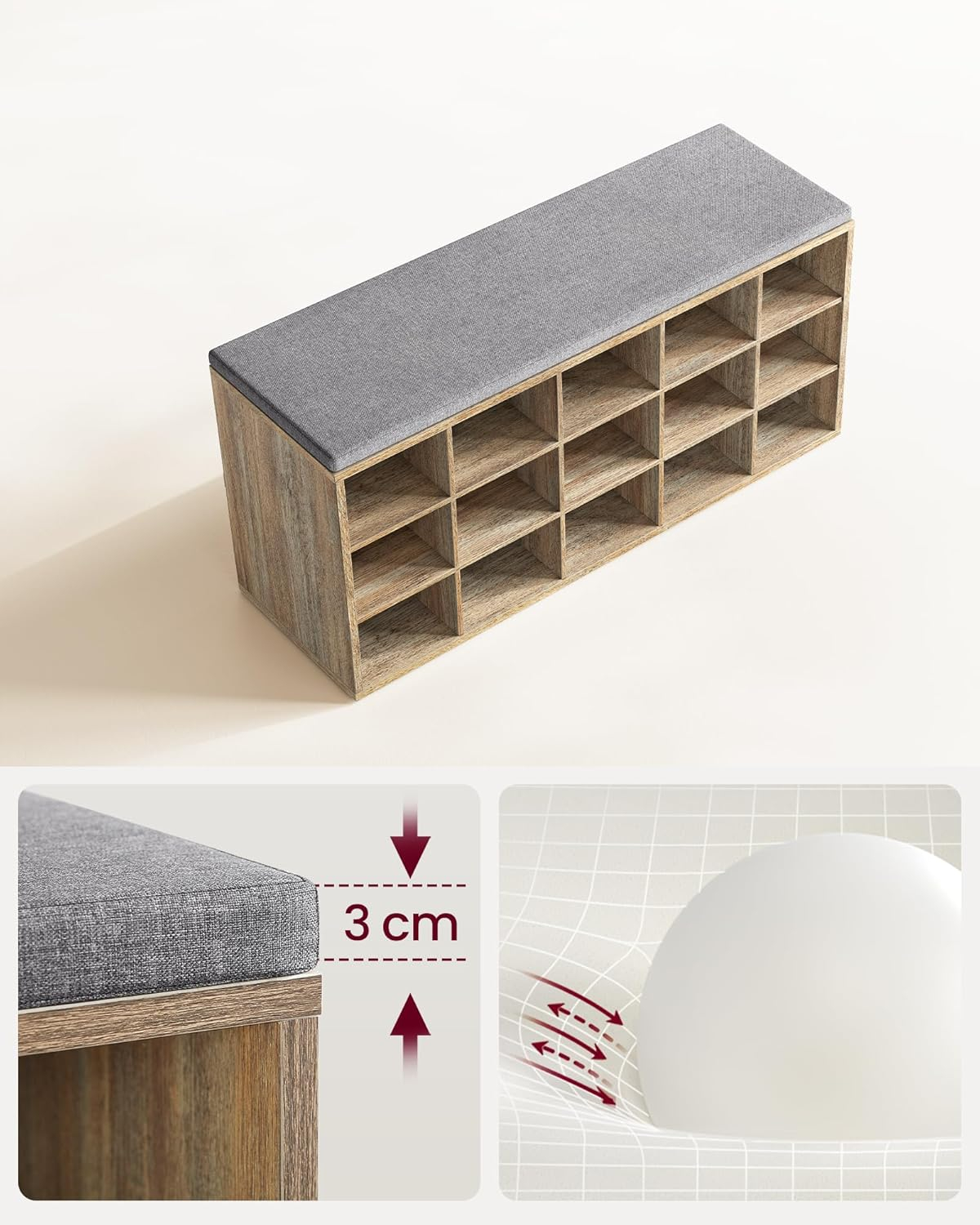 Banca pentru pantofi cu sezut confortabil, conceputa pentru organizarea eficienta a incaltamintei. Cele 15 compartimente deschise permit acces rapid la pantofi, iar perna moale ofera confort la incaltare. Potrivita pentru hol, dormitor sau living.