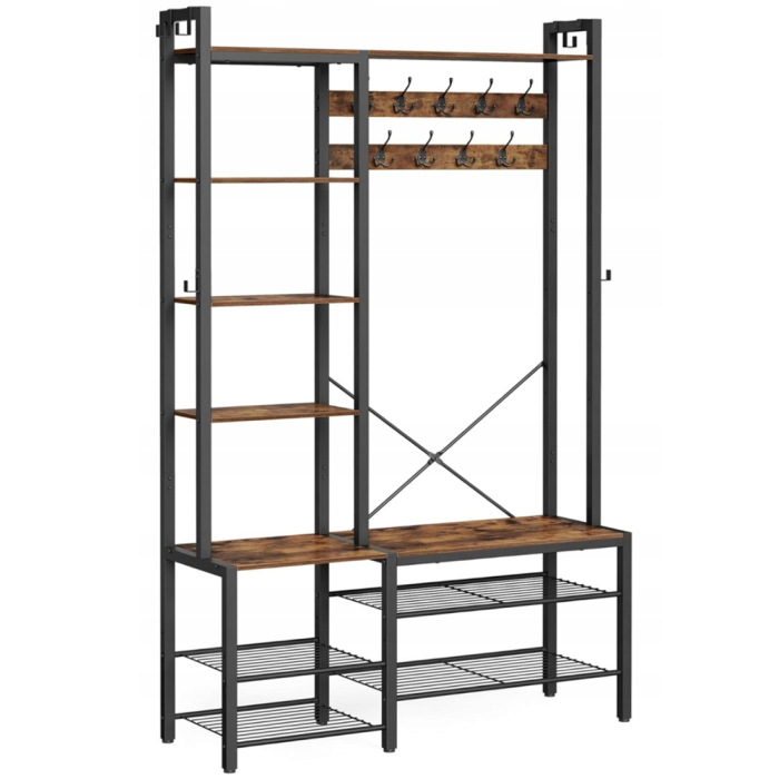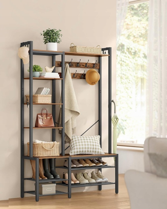 VASAGLE Cuier hol 4 in 1 cu banca, pantofar si rafturi, cadru metalic, stil industrial, 40x120x190 cm, maro rustic