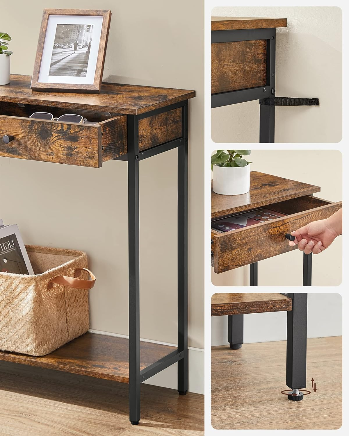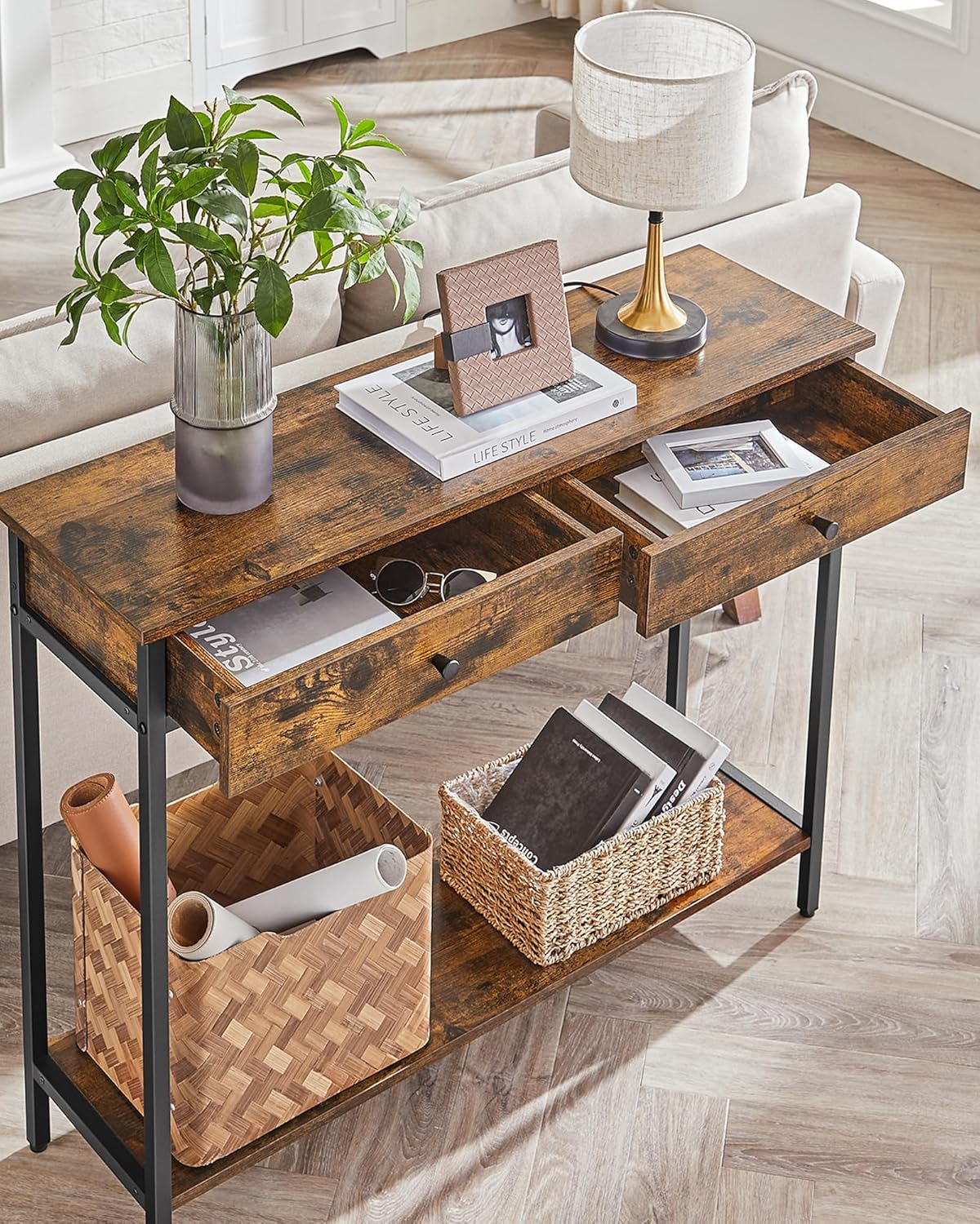 Masa consola pentru hol cu 2 sertare, stil industrial, PAL si cadru metalic, 100x30x80 cm, maro rustic