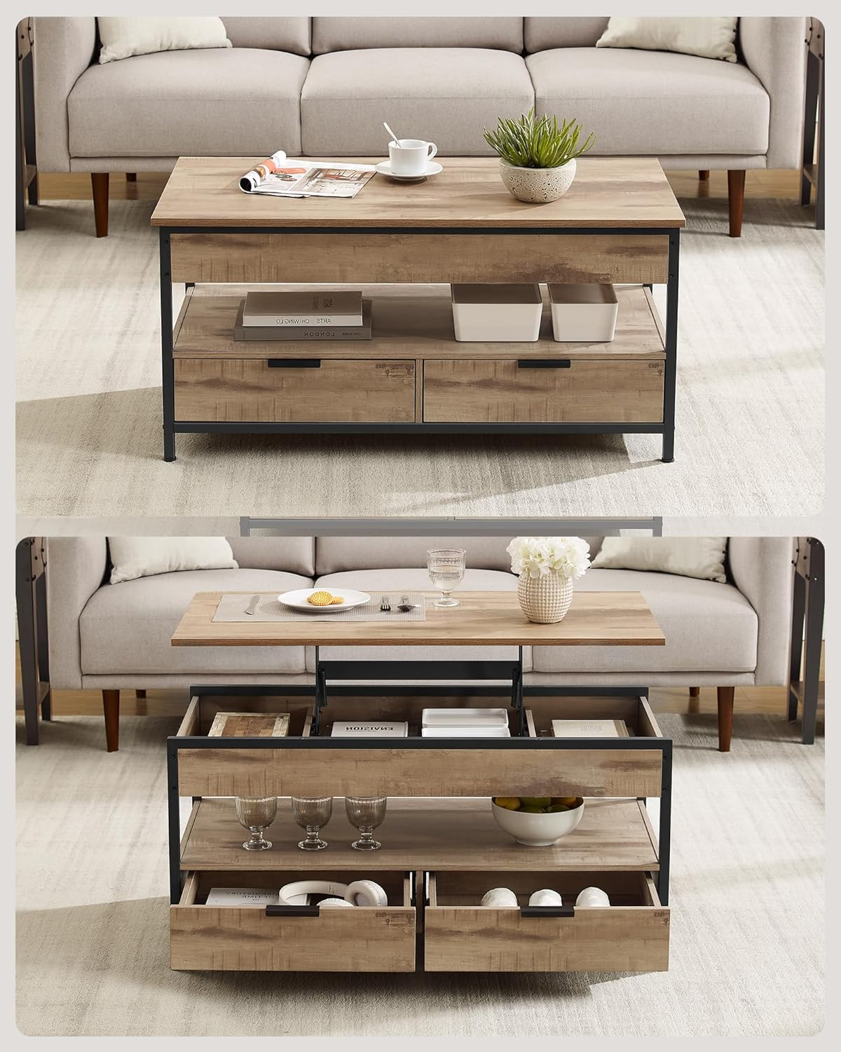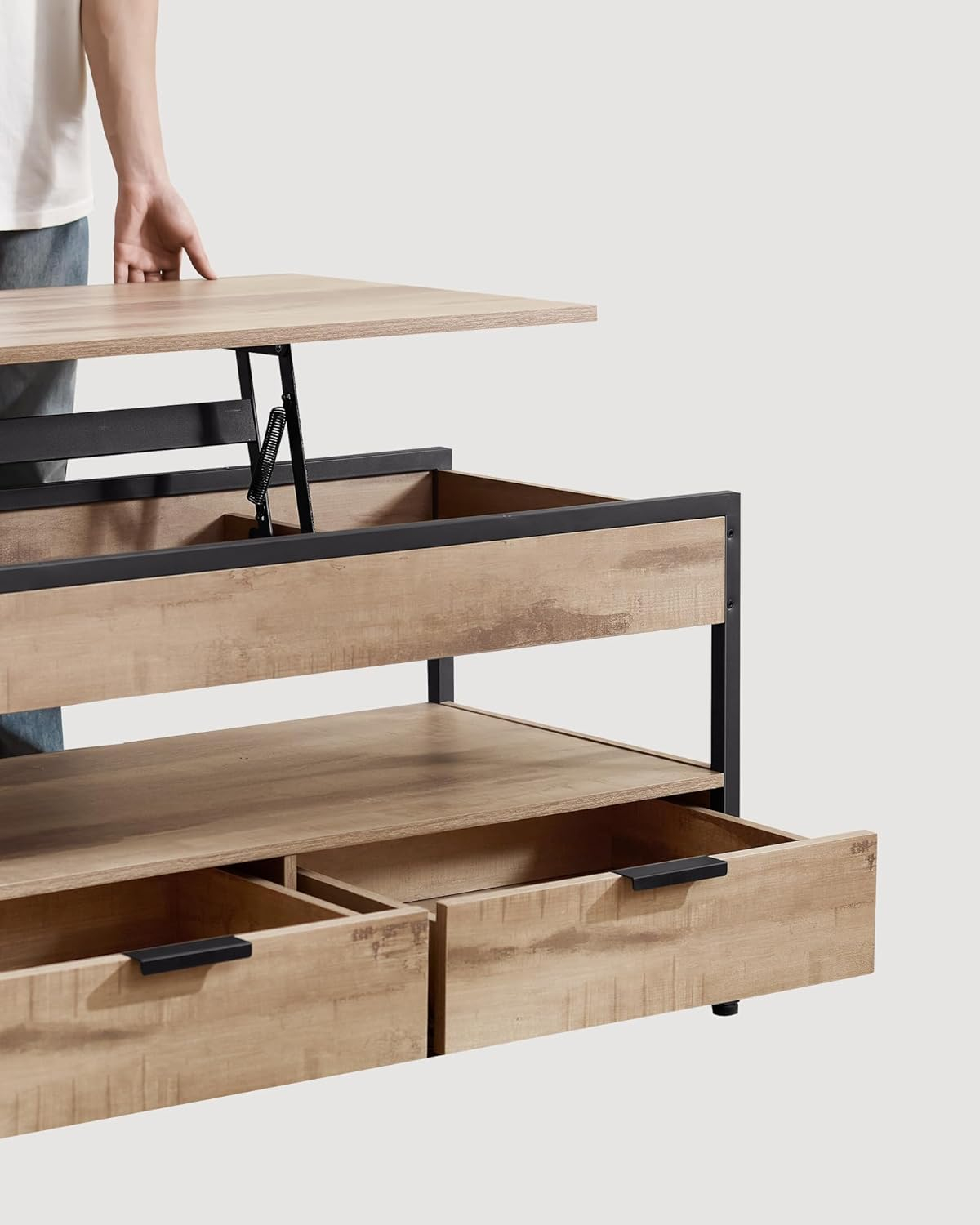 Detalii despre produs: Culoare: maro, negru Material: PAL, otel Dimensiuni: 50 x 100 cm (D x W) Inaltime: 48-63 cm Capacitatea maxima de incarcare statica a blatului mesei atunci cand este ridicat: 20 kg Capacitate totala maxima de incarcare statica: 136 kg Note: Capacitatea maxima de incarcare statica a blatului mesei atunci cand este ridicat este de 20 kg. Va rugam sa nu depasiti aceasta greutate maxima. Despre acest articol Design cu varf ridicat: Inaltimea blatului mesei poate fi reglata de la 48 cm la 63 cm, ceea ce va permite sa gasiti pozitia ideala pentru a lucra, manca sau juca atunci cand va relaxati pe canapea. Maximizati-va confortul cu aceasta masa de cafea! O multime de spatiu de depozitare: Partea superioara mare a mesei si raftul inferior ofera spatiu de depozitare deschis pentru lucrurile necesare zilnic. 3 compartimente ascunse si 2 sertare organizeaza paturile, revistele si alte obiecte mici. Blat de masa ridicat: Cu balamale metalice de inalta calitate si tija de armare, blatul acestei mese de living poate fi usor ridicat si poate sustine pana la 20 kg atunci cand este ridicat. Solida si durabila: Aceasta masa de canapea cu blat articulat este fabricata din PAL solid si un cadru din otel. Suporta pana la 136 de kilograme, astfel incat sa o puteti folosi oricand fara griji. Stil industrial elegant: Aceasta atmosfera vintage intinereste zona dvs. de living si imbunatateste estetica generala a ambiantei dvs.