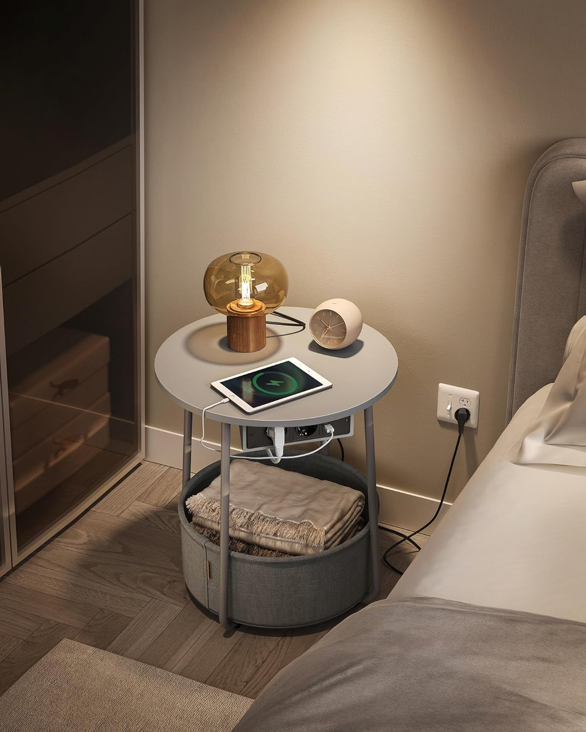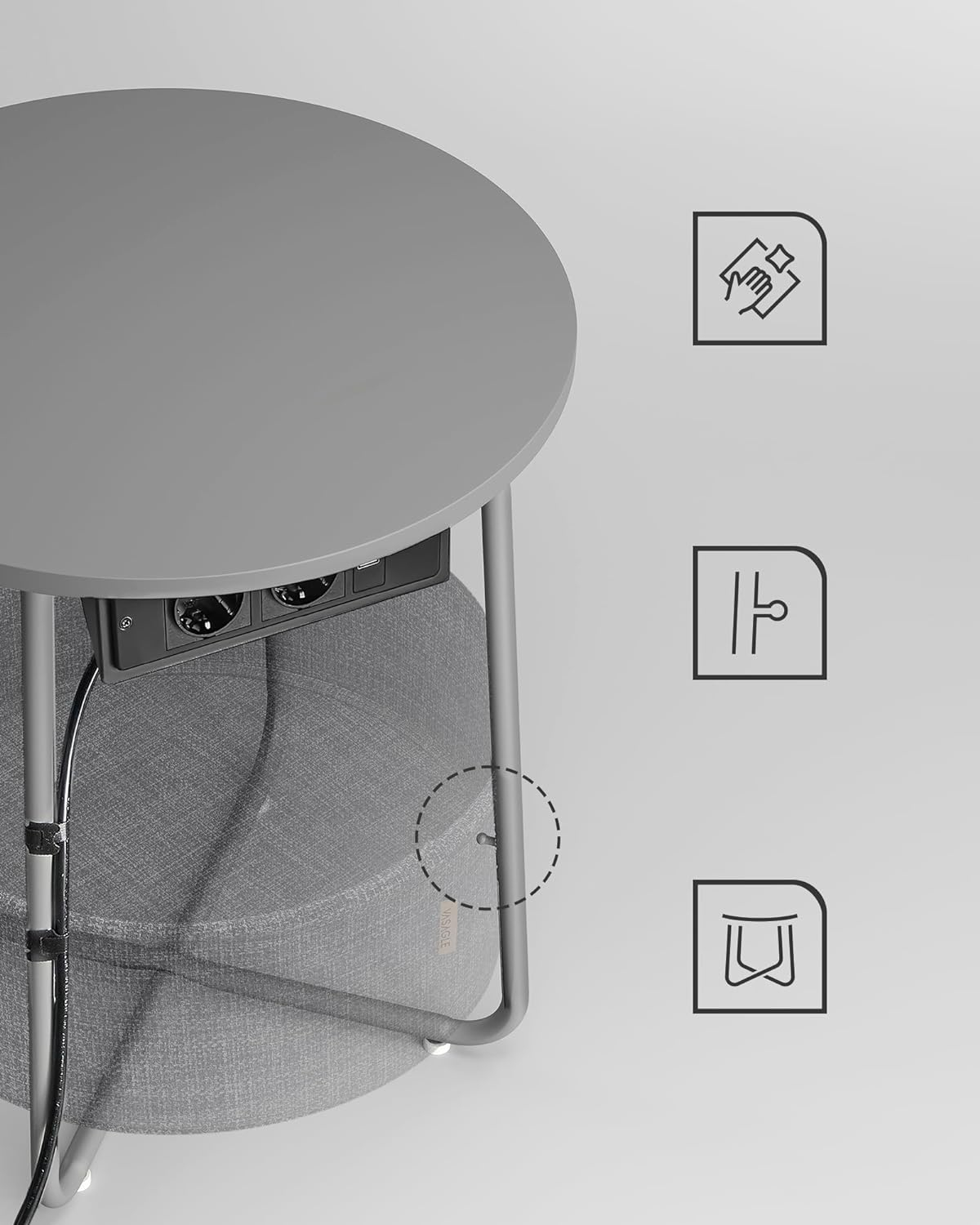 Dotata cu 2 prize si 2 porturi USB sub tava, aceasta masa laterala rotunda va ajuta sa va incarcati lampa, telefonul mobil, tableta si alte dispozitive, astfel incat sa nu mai trebuiasca sa cautati alte prize.