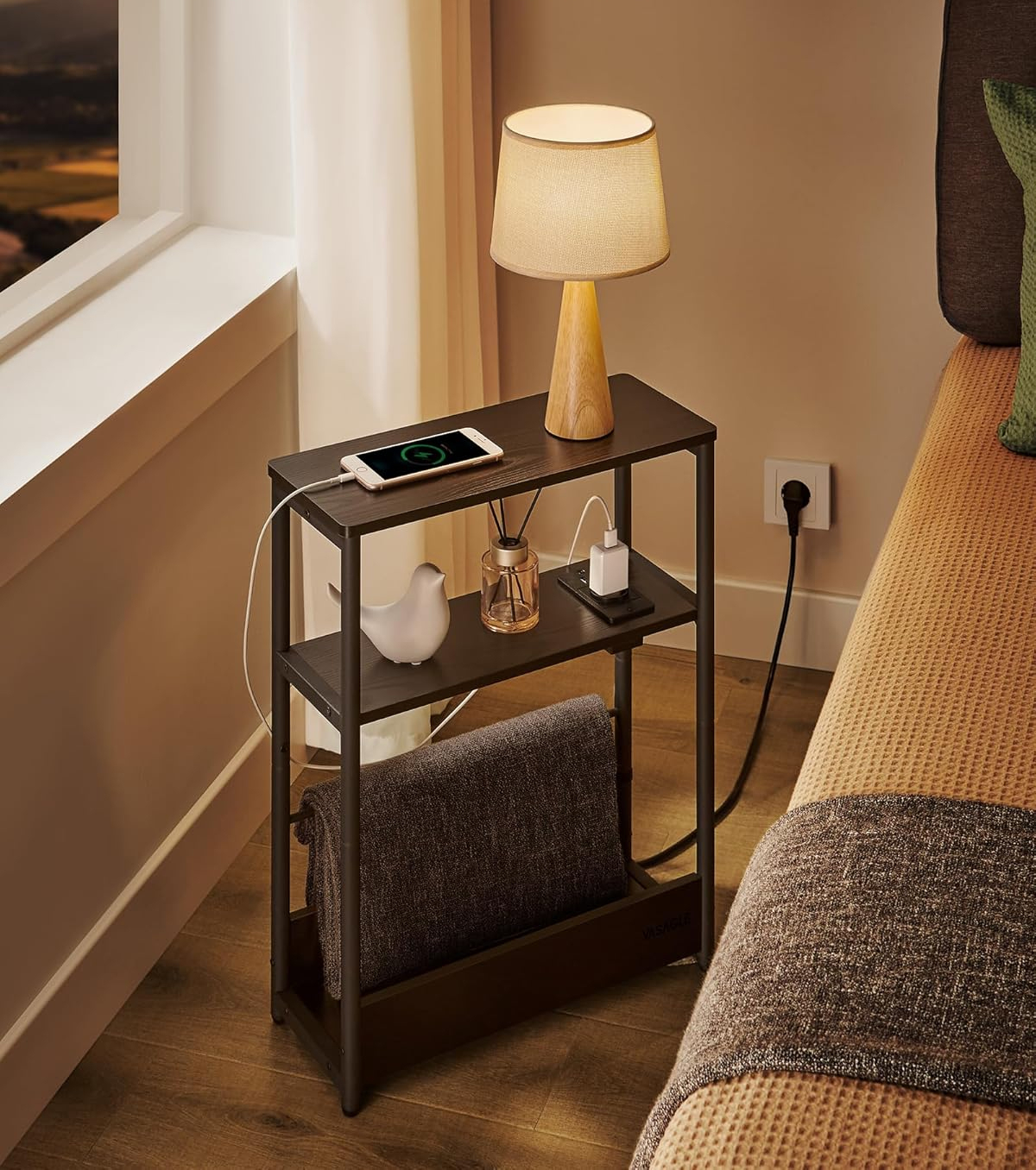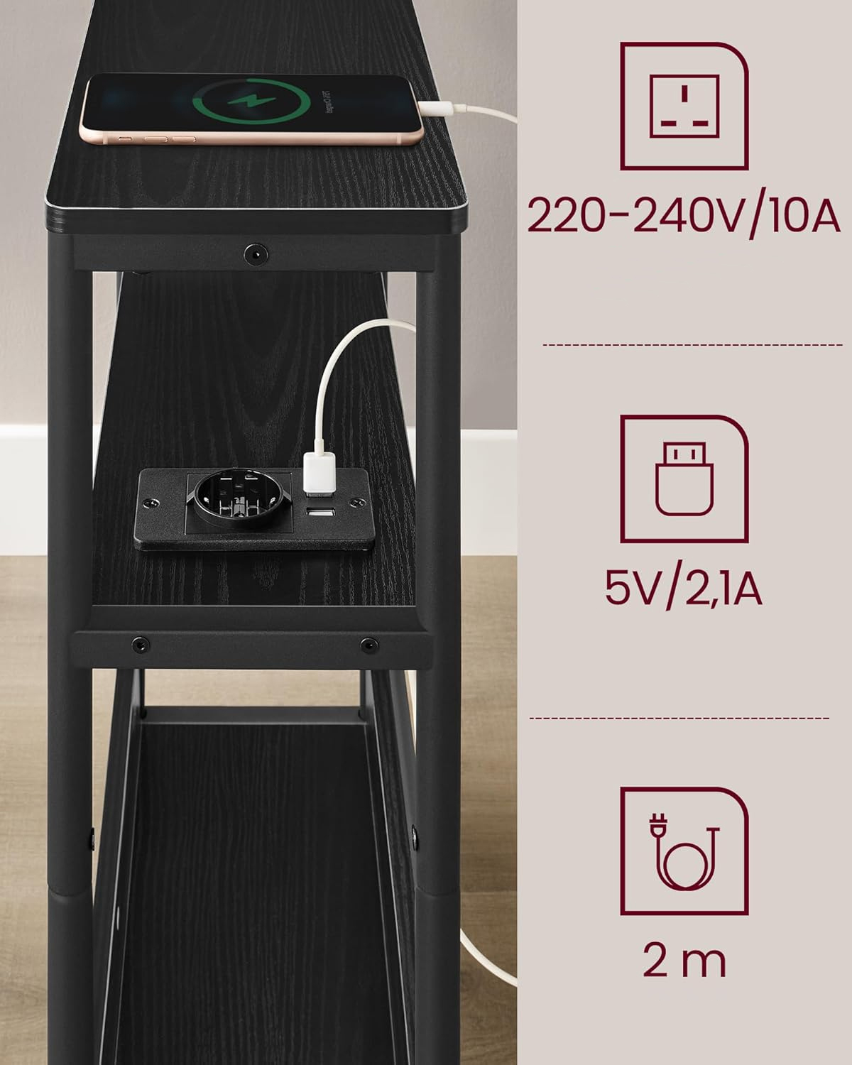 Masuta laterala VASAGLE este solutia ideala pentru spatiile mici, cu doar 18 cm latime. Ofera 3 rafturi utile pentru depozitare si un port de incarcare incorporat cu USB si priza AC. Practica, stabila si usor de montat, se potriveste perfect langa pat, canapea sau birou.